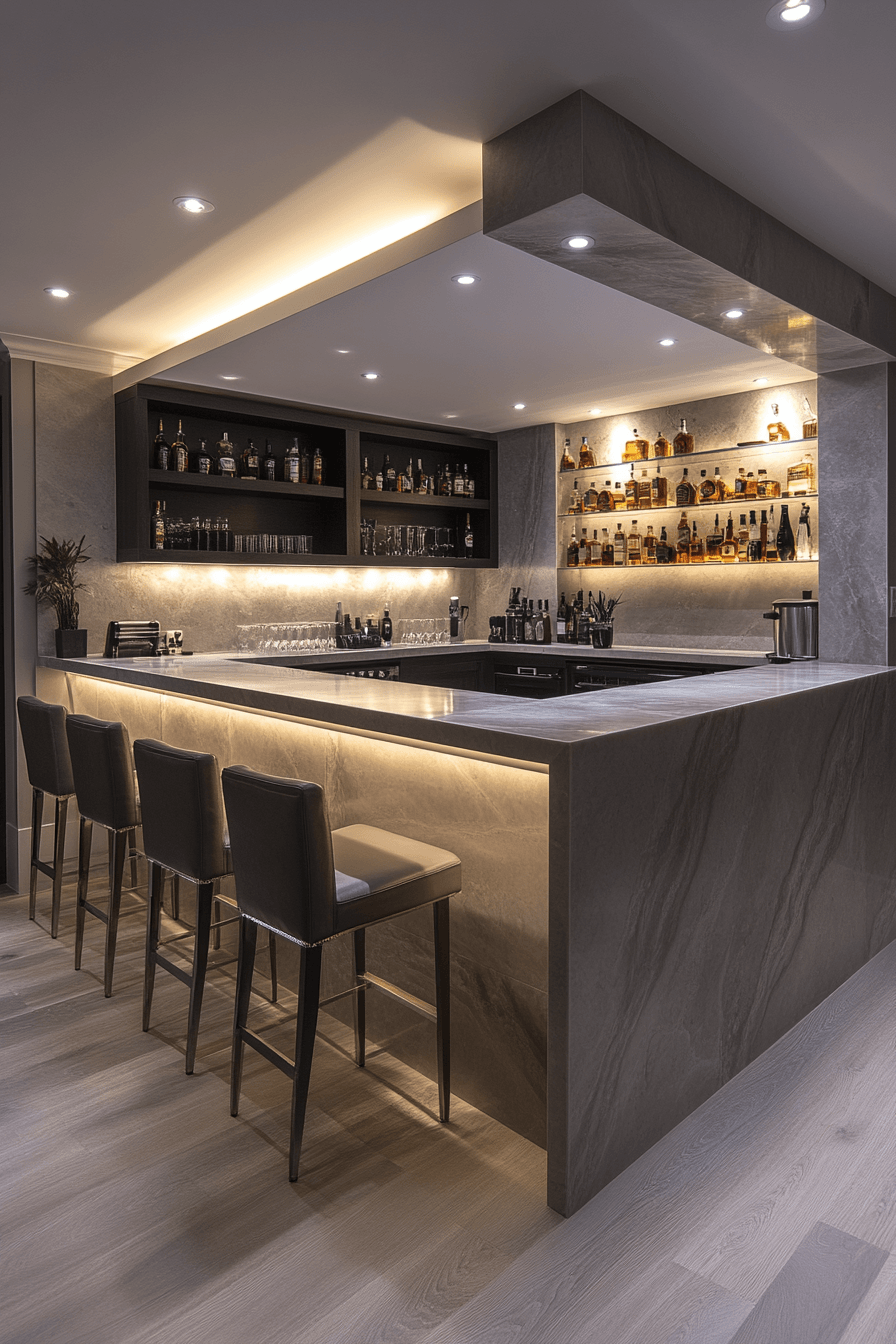 Marble surfaces elevate these basement bar ideas with a luxurious and polished feel. Smooth counters paired with metallic accents create elegance. Open shelving displays glassware beautifully. Ambient lighting enhances the refined atmosphere. Every element feels upscale and intentional. Upgrade your space with basement bar ideas that feel sophisticated.