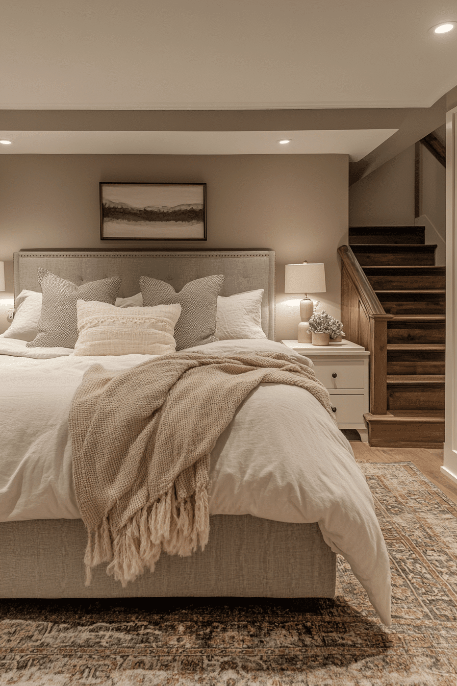 Earthy palettes bring warmth into basement bedroom ideas, making them feel grounded and cozy. Shades like beige, taupe, and soft brown create comfort. Layered textiles add softness and depth. Warm lighting enhances the relaxing atmosphere. Wood furniture introduces natural charm. Add warmth to your basement bedroom ideas with earthy tones.