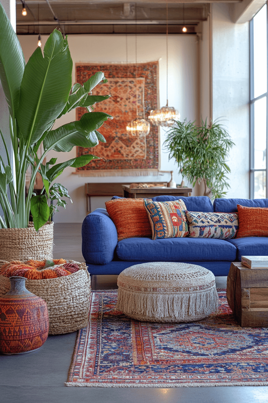 Global patterns and bold color combinations create a rich, layered design full of personality. This boho chic aesthetic mixes deep hues with handcrafted textiles for depth. Modern lighting adds a refined contrast. The space feels eclectic yet cohesive. Every detail adds visual interest. Explore more fusion-style boho chic aesthetic ideas for a bold statement.