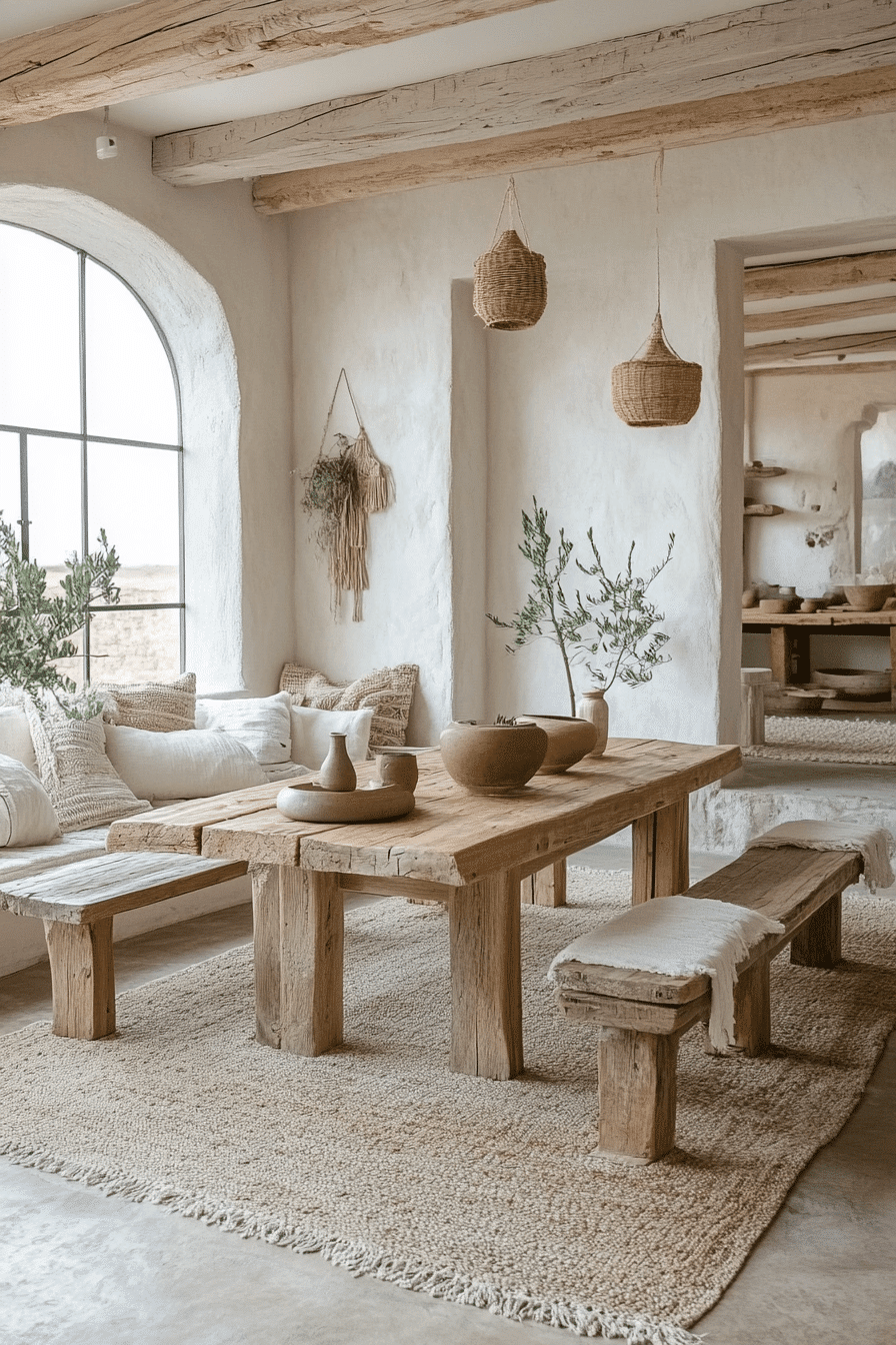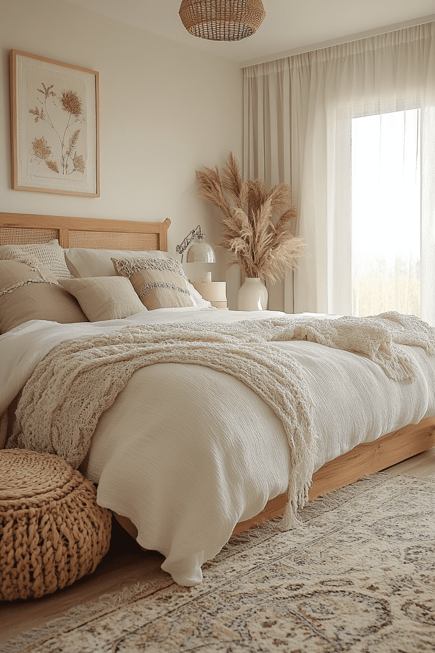 Calm neutrals paired with subtle accents create a peaceful and balanced environment. This boho chic aesthetic focuses on layered linens, wood, and soft lighting for comfort. Plants add life without overwhelming the design. The look feels minimal yet detailed. Every element enhances tranquility. Explore more serene boho chic aesthetic ideas for a calming space.