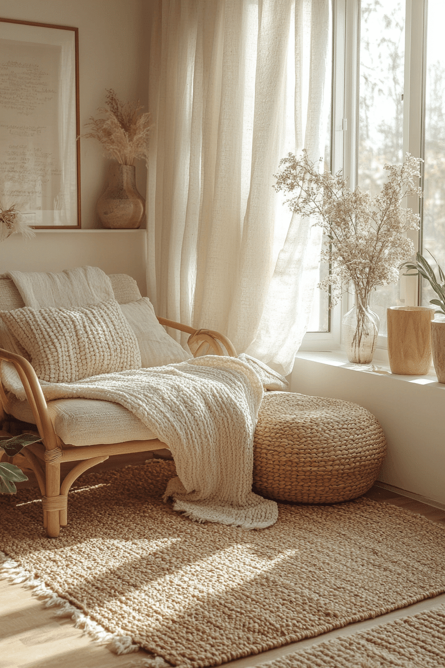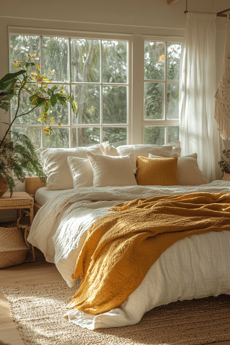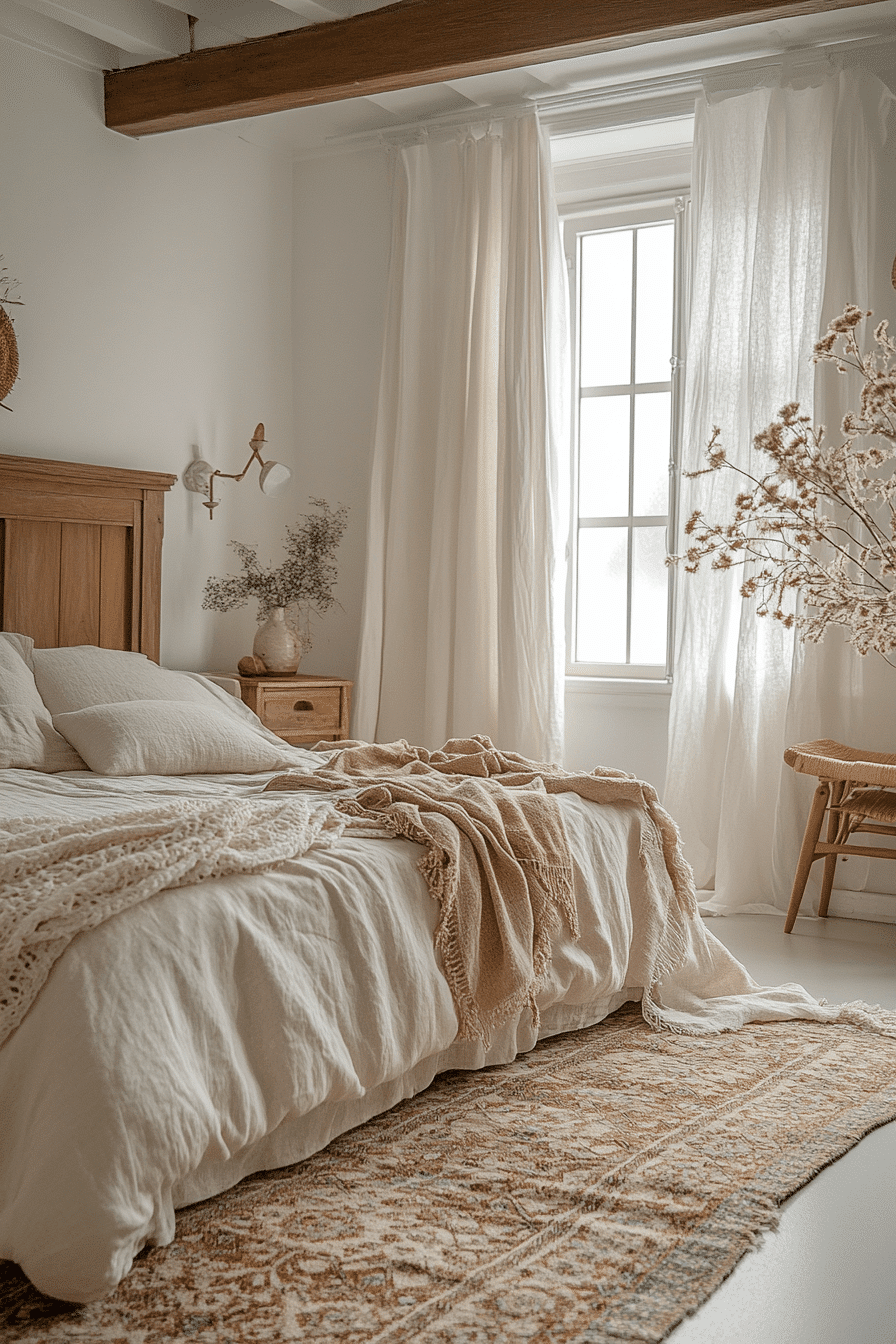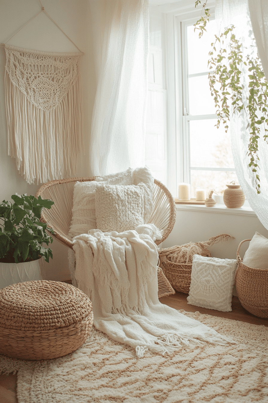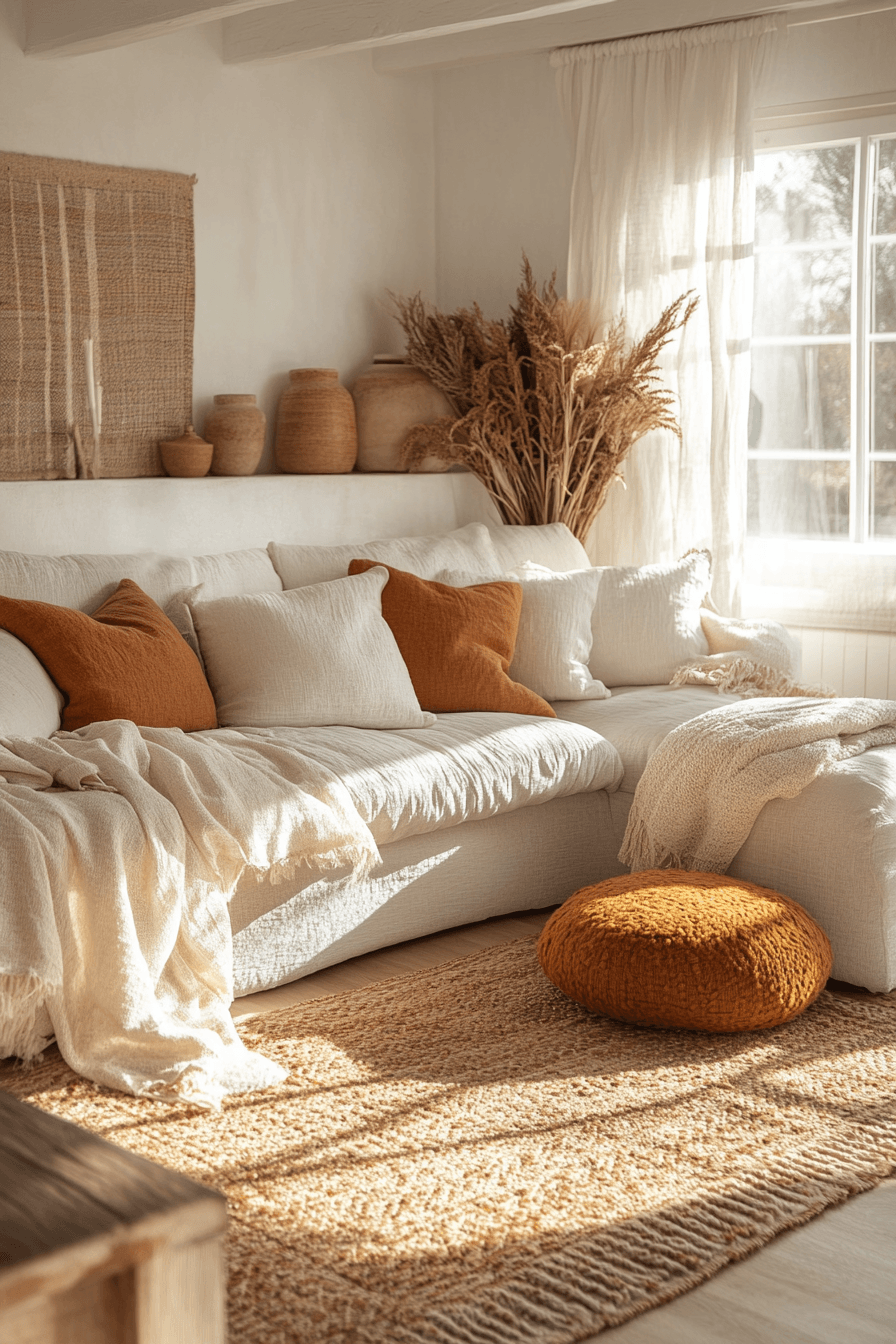 Layered textiles and soft materials create a cozy environment that feels warm and inviting. This boho chic aesthetic blends neutral tones with pops of color for balance. Cushions, rugs, and fabrics add depth and comfort. Sheer curtains soften the overall look. The design feels timeless and relaxed. Explore more layered boho chic aesthetic ideas that feel effortlessly cozy.