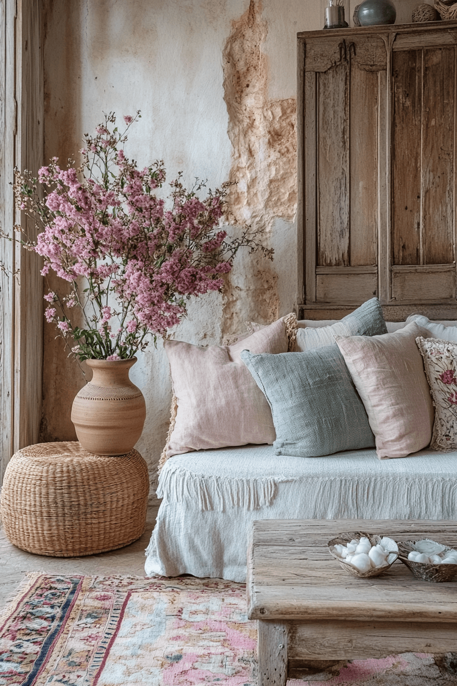 Soft pastels and floral touches create a dreamy, garden-inspired atmosphere filled with charm. This boho chic aesthetic blends delicate colors with rustic textures for balance. Layered rugs and wooden elements add warmth. Natural light enhances the soft hues beautifully. The design feels peaceful and romantic. Explore more whimsical boho chic aesthetic ideas for a gentle look.