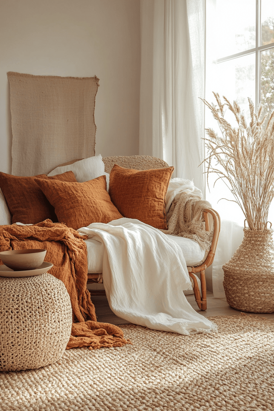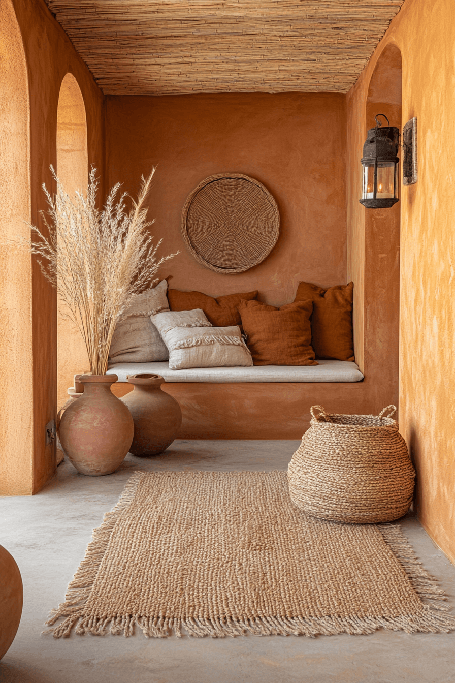 Rich terra tones create a warm and luxurious atmosphere that feels both grounded and elegant. This boho chic aesthetic uses rust, amber, and clay shades for depth. Soft lighting enhances textures beautifully. Woven accents add charm and dimension. The space feels calm and refined. Explore more terra-inspired boho chic aesthetic ideas for a cozy look.