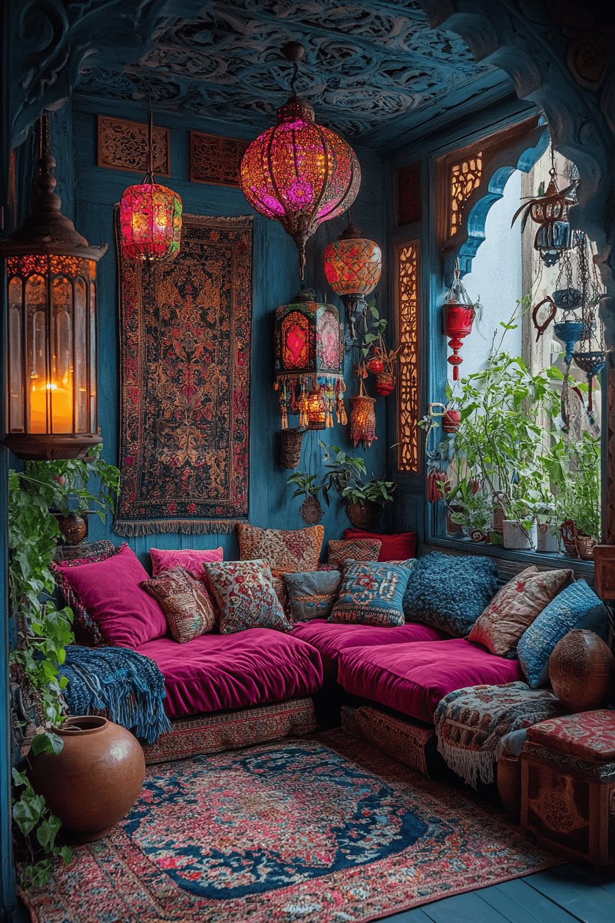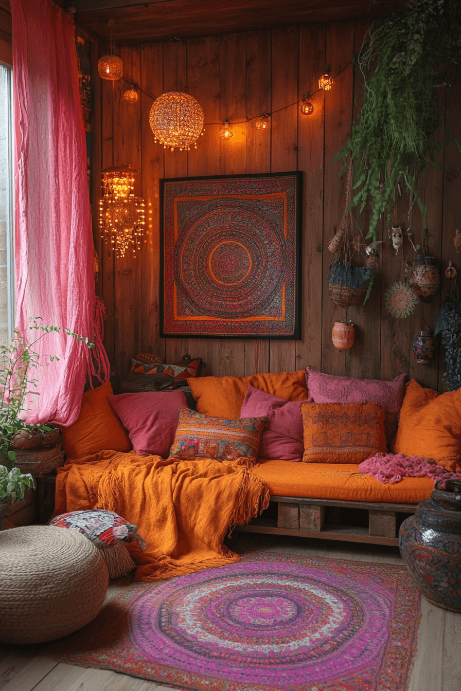Jewel tones and layered textures create a mystical and enchanting atmosphere full of depth. This boho chic aesthetic uses velvet fabrics and intricate patterns for richness. Plants and wood accents balance the bold palette. The space feels cozy and magical. Every detail adds intrigue. Discover more mystical boho chic aesthetic ideas for an artistic retreat.
