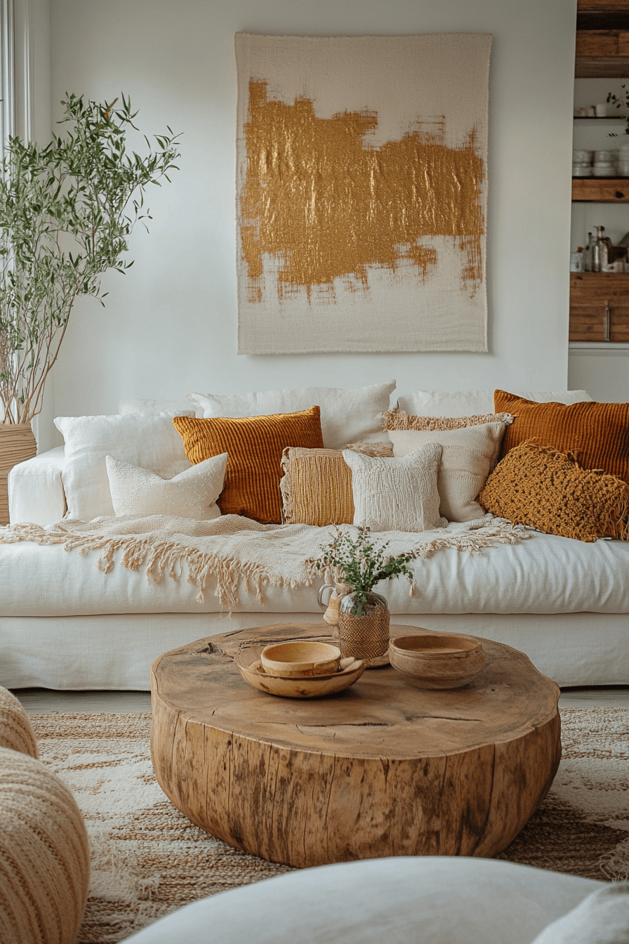 Golden accents and warm lighting introduce a subtle glow that feels both elegant and inviting. This boho chic aesthetic pairs neutral tones with metallic details for contrast. Layered textiles maintain the cozy feel. Handcrafted elements keep the look authentic. The design feels refined yet relaxed. Explore more golden-inspired boho chic aesthetic ideas for a warm, glowing space.