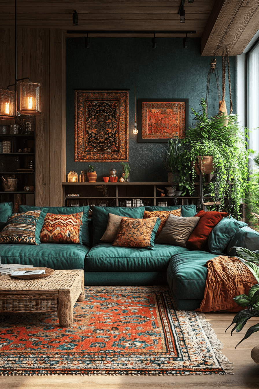 Rich jewel tones create a luxurious yet approachable environment filled with bold color and texture. This boho chic aesthetic blends emerald, ruby, and sapphire hues beautifully. Natural fibers balance the richness. The design feels vibrant yet grounded. Every detail adds character. Discover more jewel-toned boho chic aesthetic ideas for a bold home.