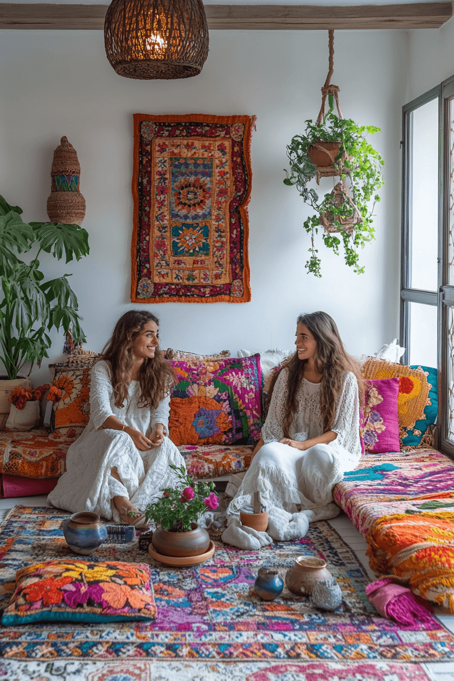 Bright color layers and eclectic textures bring a lively, expressive energy into this boho chic aesthetic. Patterned fabrics, woven baskets, and bold accents create a playful yet cohesive look. The mix of contrast adds personality without overwhelming the space. Natural woods, plants, and handcrafted décor ground the vibrancy with warmth. Every detail feels joyful and inviting. Explore more vibrant boho chic aesthetic ideas that celebrate bold, creative living.