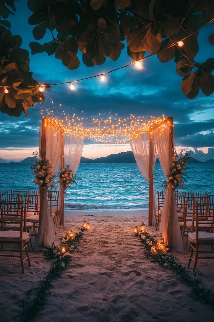 A celestial beach ceremony brings starlit magic to the shore, making it a dreamy pick for boho wedding ideas. The soft sand, whispering waves, and twinkling stars create a naturally romantic backdrop. Simple accents like fairy lights and flowing fabrics add a touch of whimsy.