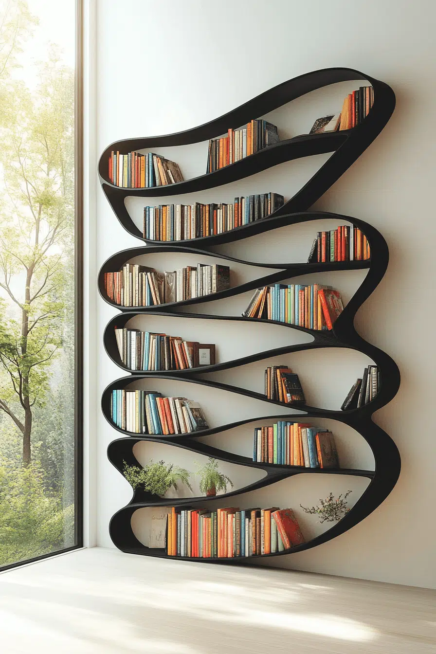 Create visual interest with innovative bookshelf ideas that incorporate zigzag patterns in corner spaces. This playful design turns unused corners into eye-catching displays while maximizing storage potential. The simple geometric pattern can be created using basic boards and brackets, making it an affordable weekend project.