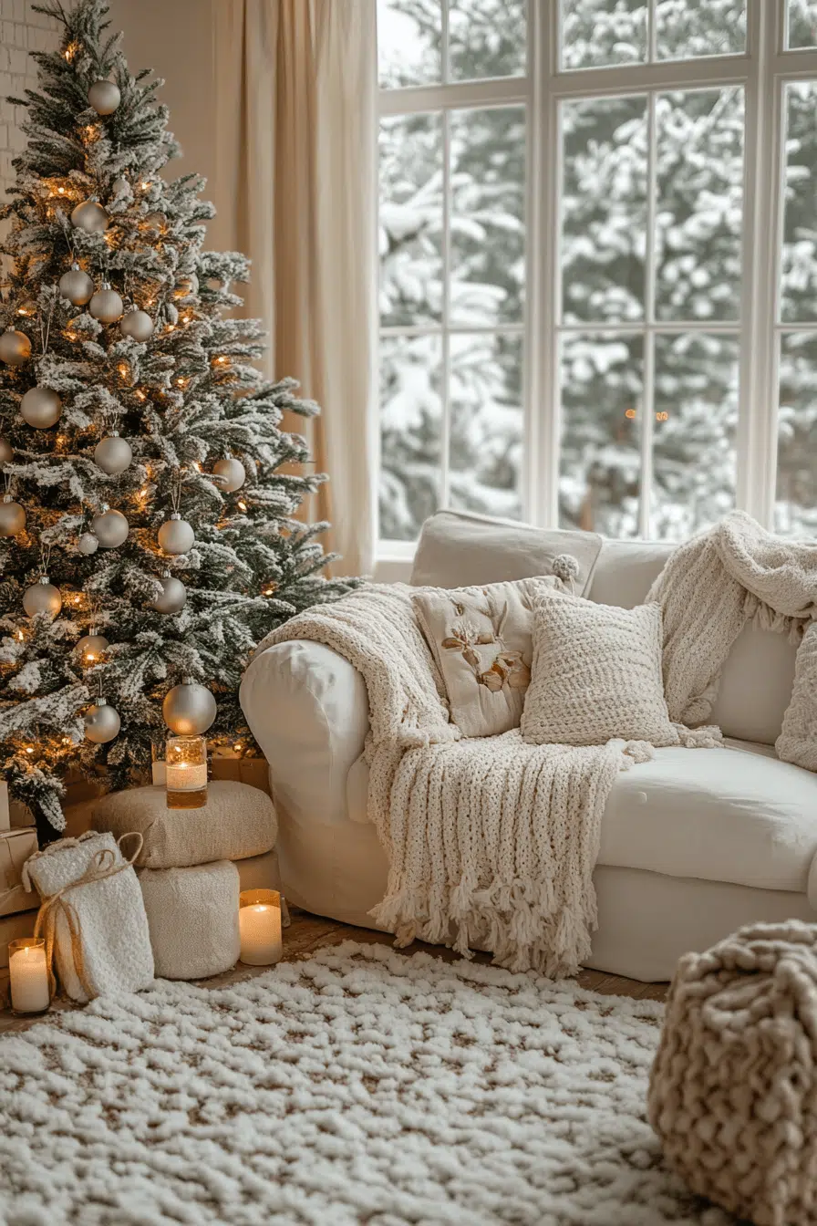 Soft whites, flickering lights, and minimal accents come together to create an indoor snowfall effect that feels gentle and magical. The atmosphere is bright yet calm, echoing the stillness of fresh snow. Tactile materials like knits and wool add depth without overwhelming the senses. Every choice contributes to a peaceful, wintry glow.
