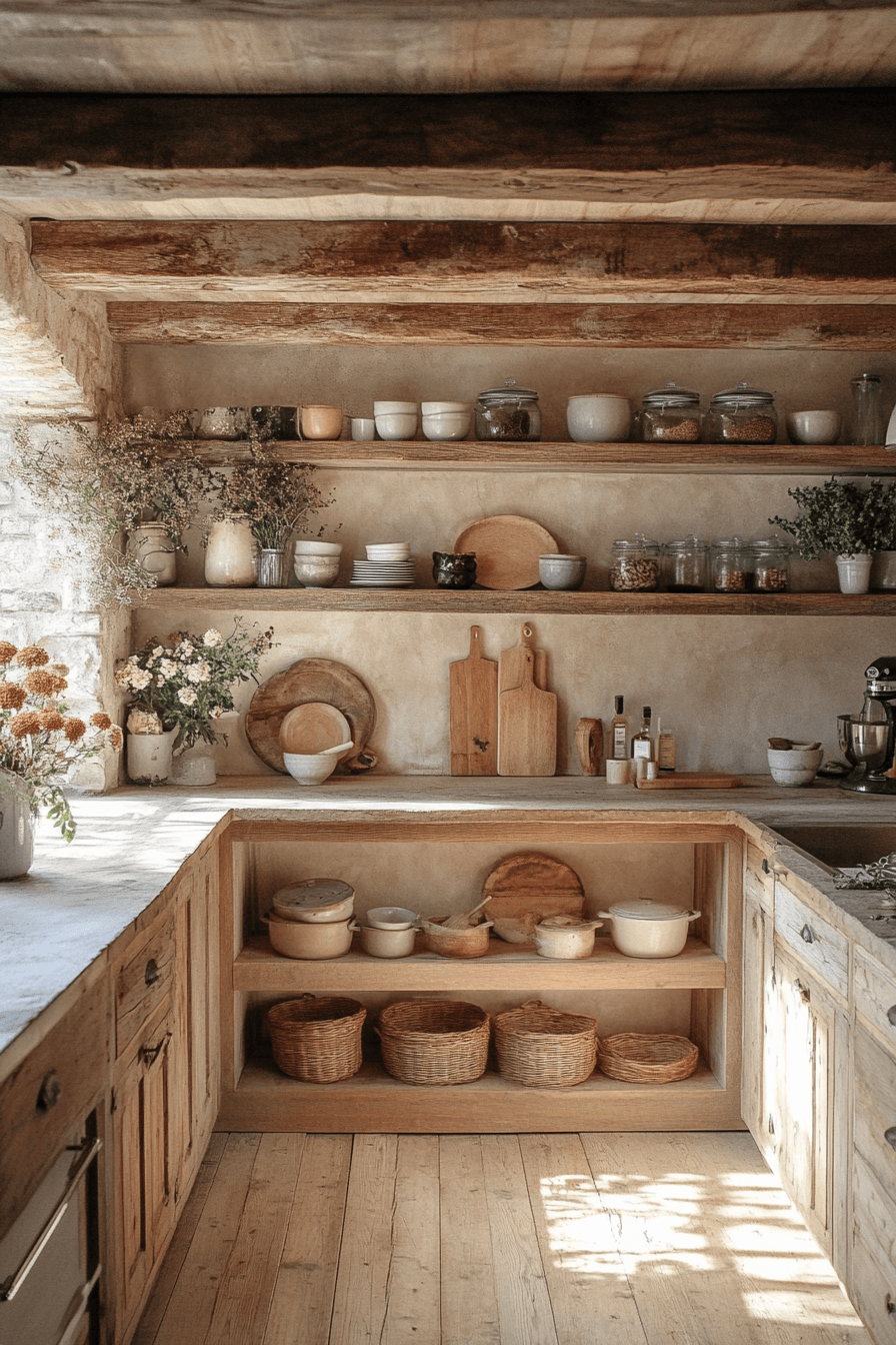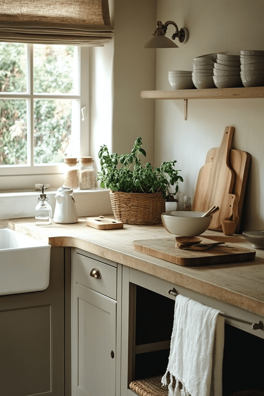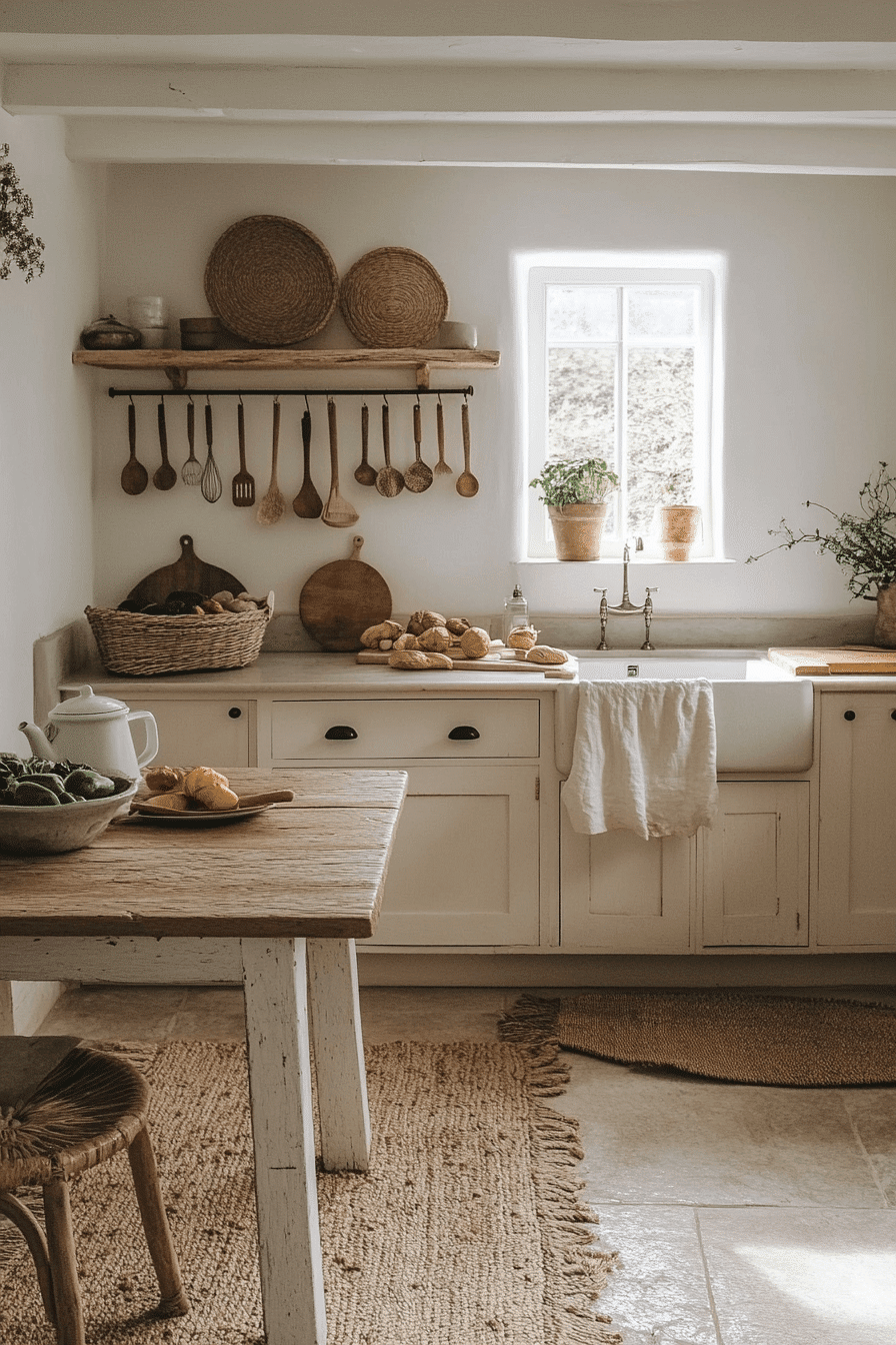Neutral shades create a soft retreat that feels calm and balanced throughout. This cottagecore kitchen uses creams, taupes, and light grays to build a soothing palette. Wooden details add natural warmth without overwhelming the space. Woven baskets and simple ceramics provide both beauty and function. The design feels grounded and inviting. Tap to discover more neutral cottagecore kitchen ideas.