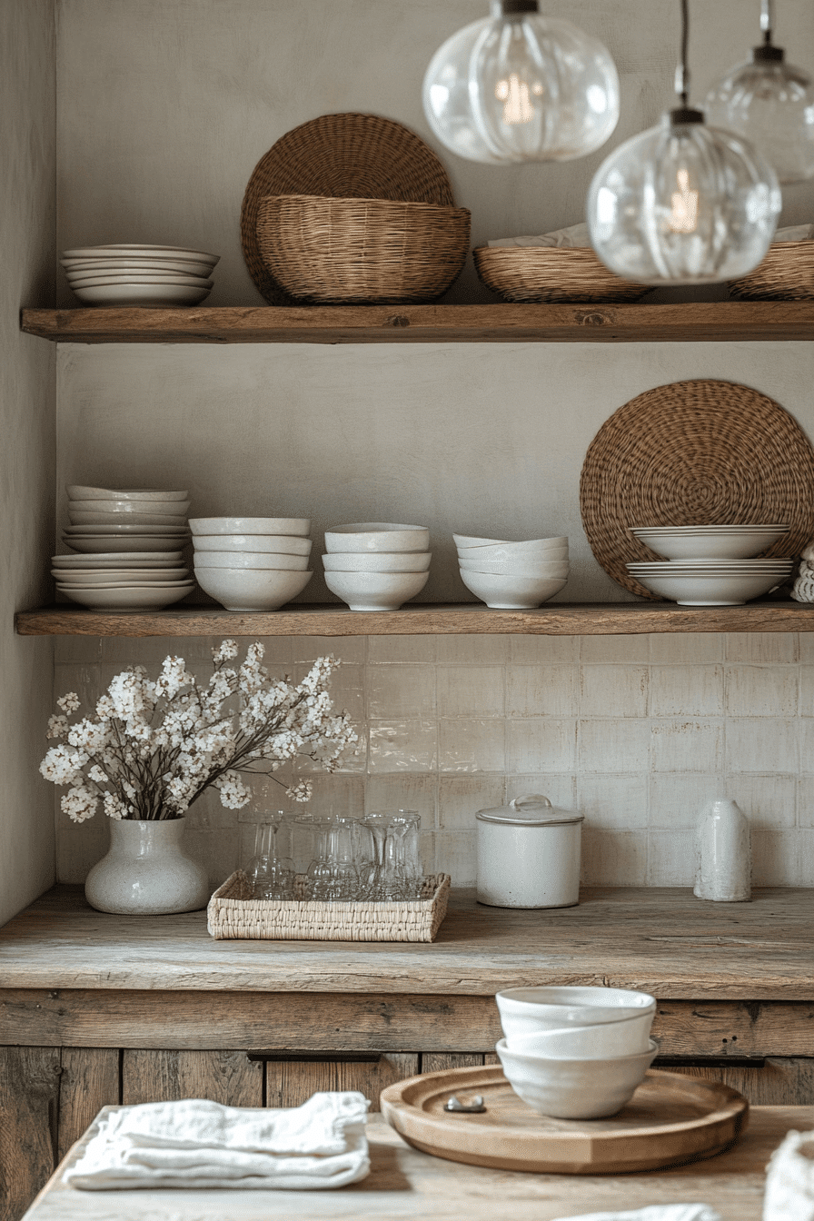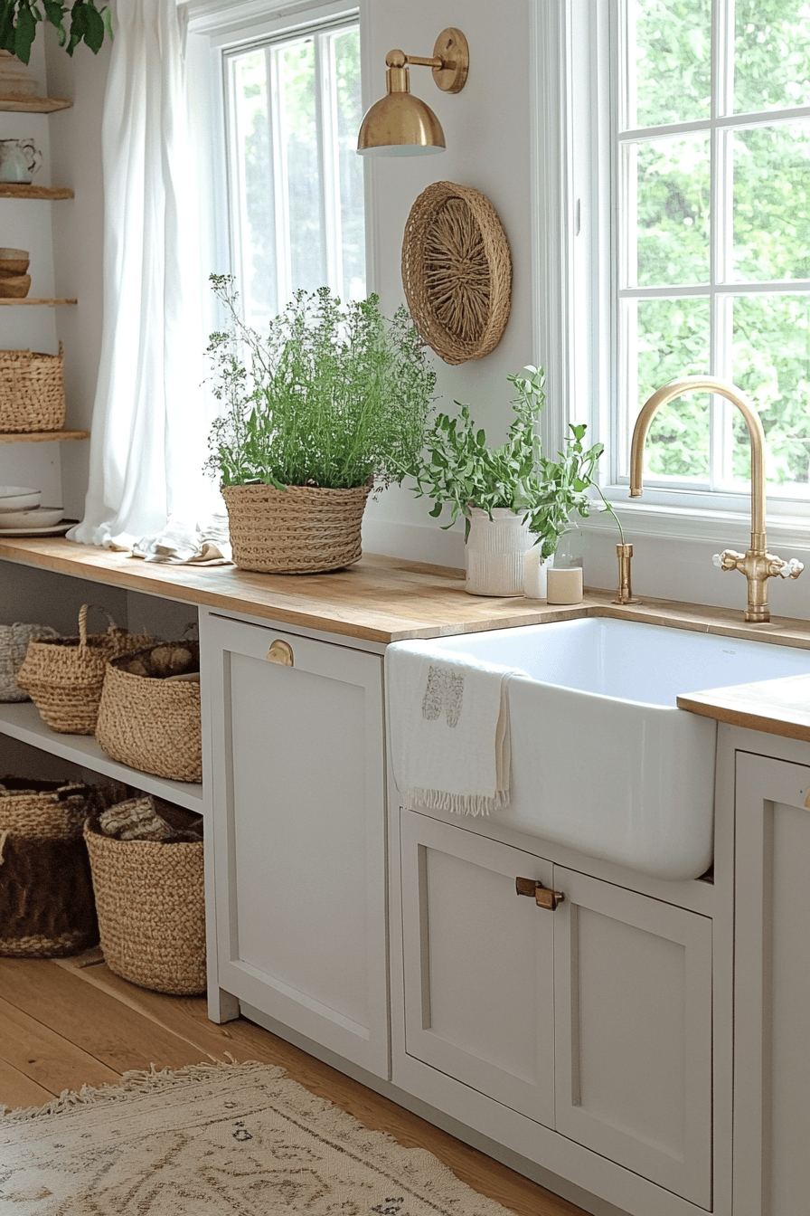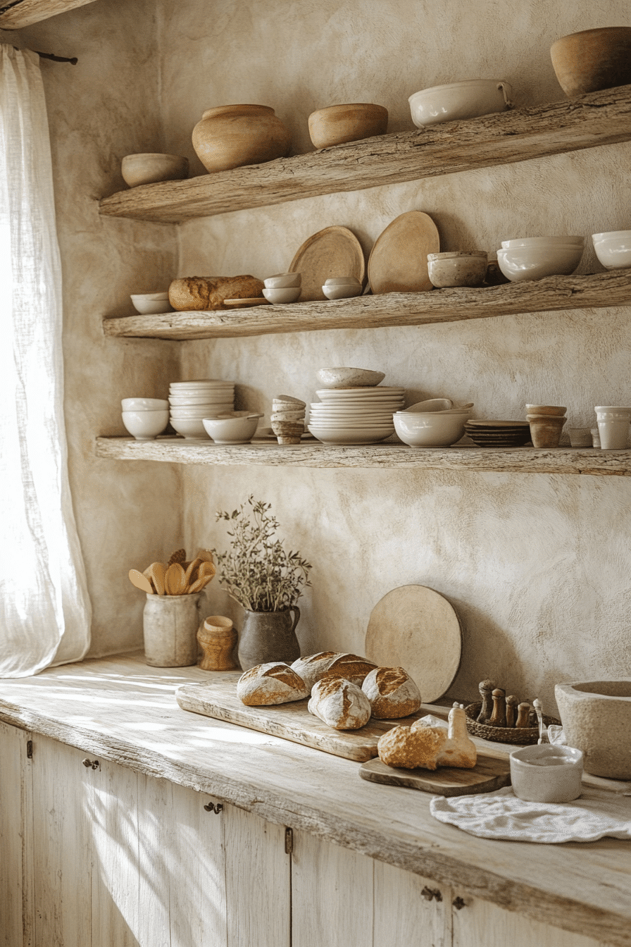 Neutral shades create a soft retreat that feels calm and balanced throughout. This cottagecore kitchen uses creams, taupes, and light grays to build a soothing palette. Wooden details add natural warmth without overwhelming the space. Woven baskets and simple ceramics provide both beauty and function. The design feels grounded and inviting. Tap to discover more neutral cottagecore kitchen ideas.