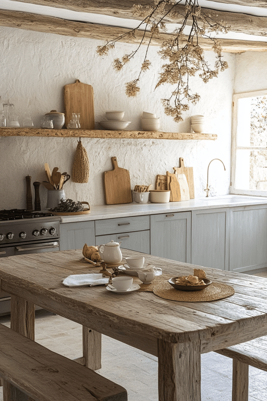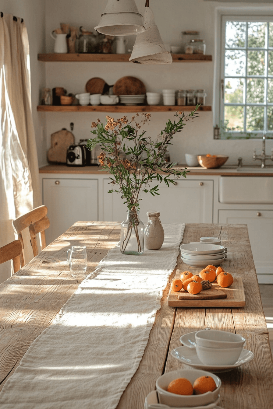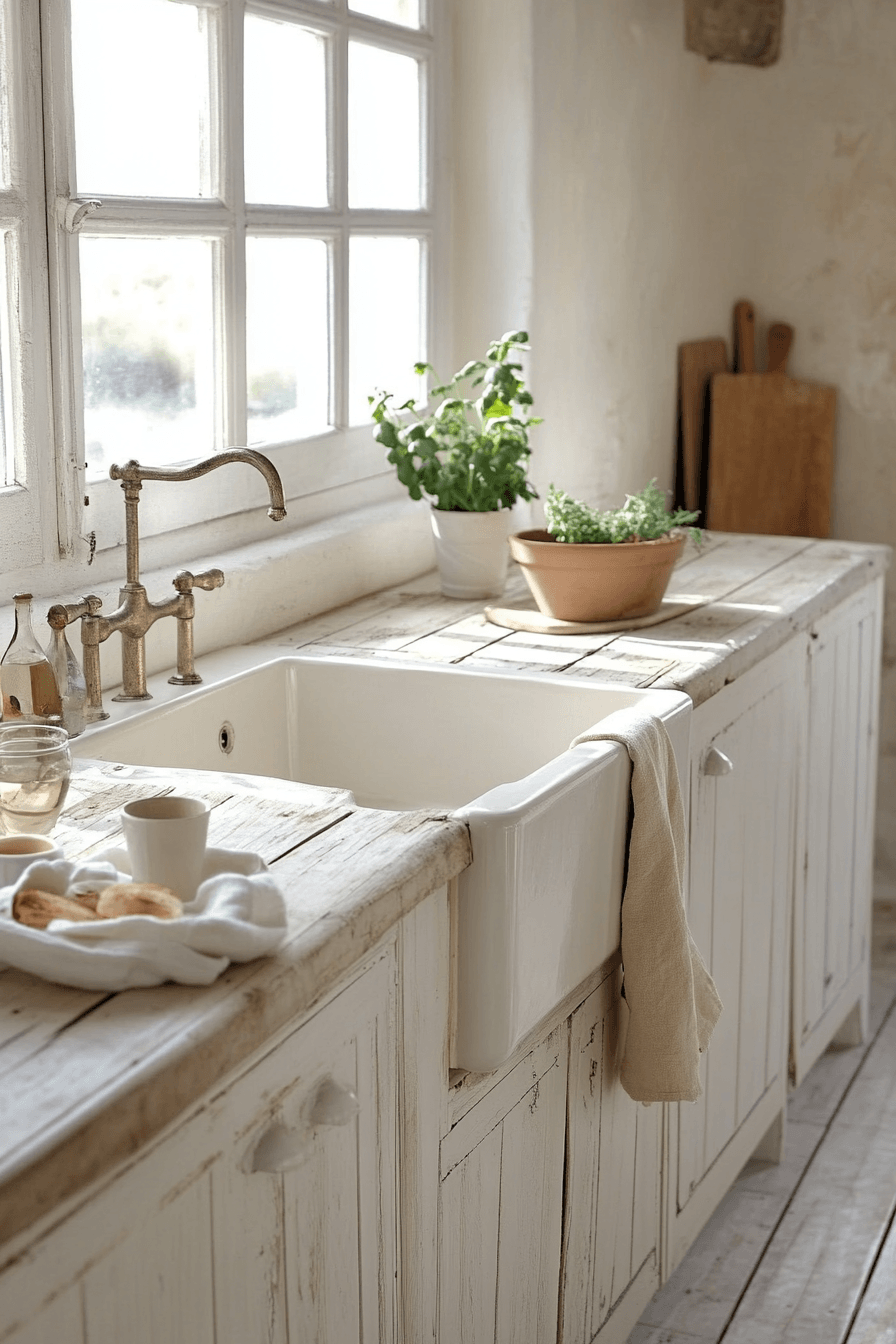 Lightwashed tones of white and sand create a bright, airy environment that feels fresh and peaceful. This cottagecore kitchen reflects sunlight beautifully across painted wood and soft surfaces. Minimal cabinetry keeps the design intentional and calm. Layered linens add texture without clutter. The space feels ideal for slow mornings and quiet meals. Click to explore more lightwashed cottagecore kitchen inspiration.
