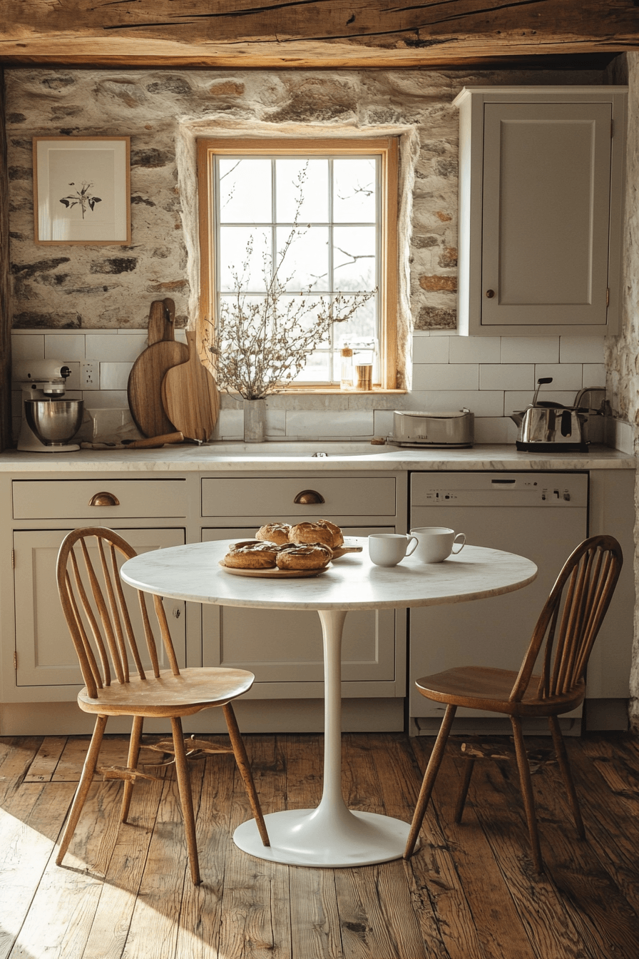 Minimal styling proves that simplicity can still feel warm and welcoming. This cottagecore kitchen uses clean lines and soft textures to create balance. Neutral tones allow natural materials to shine. Wooden seating and gentle accents add comfort. The space feels uncluttered and inviting. Click to see more minimal cottagecore kitchen ideas.