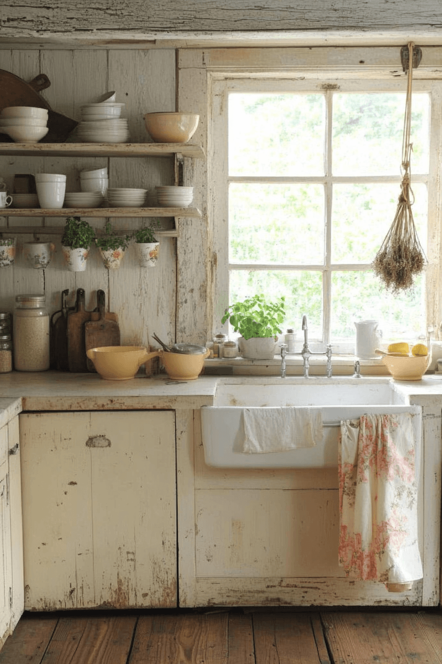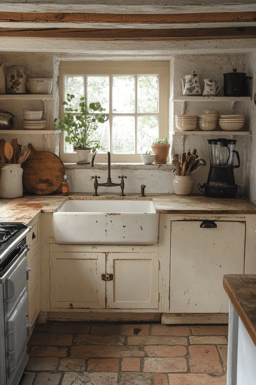 Timeworn finishes add authenticity and charm, creating a space that feels both practical and beautiful. This cottagecore kitchen embraces distressed textures and aged details. The design feels relaxed and inviting. Soft textiles balance the rustic elements. Every piece adds character. Click to explore more vintage-inspired cottagecore kitchen ideas.