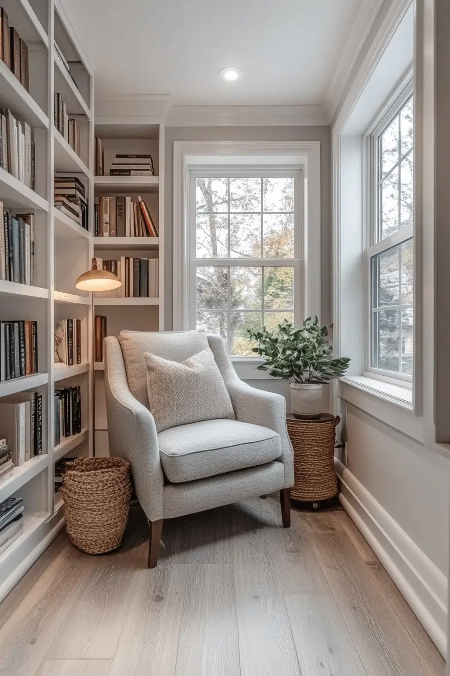 Transform your sunny room into a cozy home library that celebrates natural light and outdoor views. Simple shelving arranged around windows creates the perfect balance of storage and brightness. Comfortable seating positioned to enjoy the view makes reading even more enjoyable.