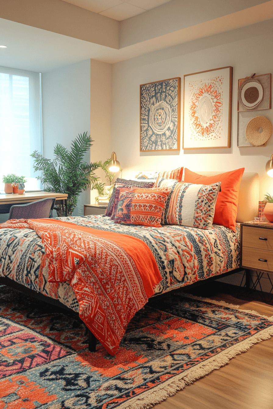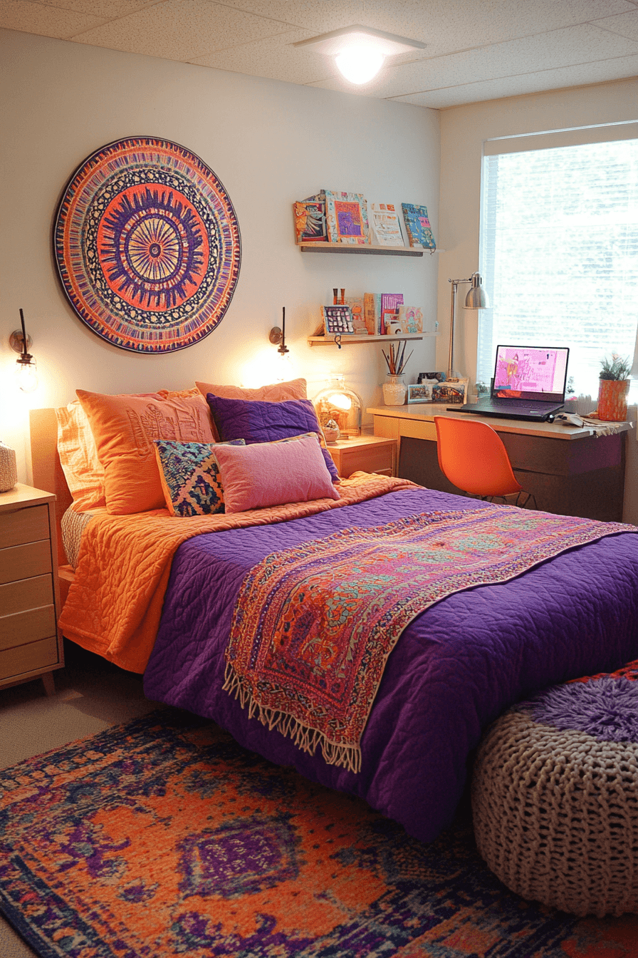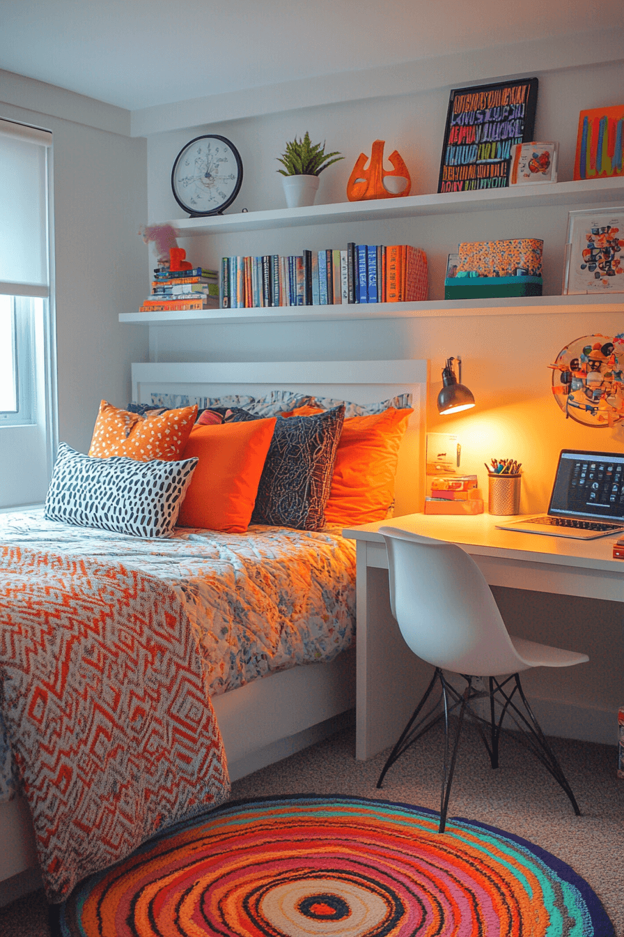Mixing textures and colors creates visually exciting dorm room ideas full of personality. Layered rugs, patterned cushions, and vibrant bedding add depth to the design. Contrasting wall art enhances the creative atmosphere. Functional shelving keeps everything organized and stylish. This setup is perfect for expressing individuality. Tap to explore more artistic dorm inspiration.