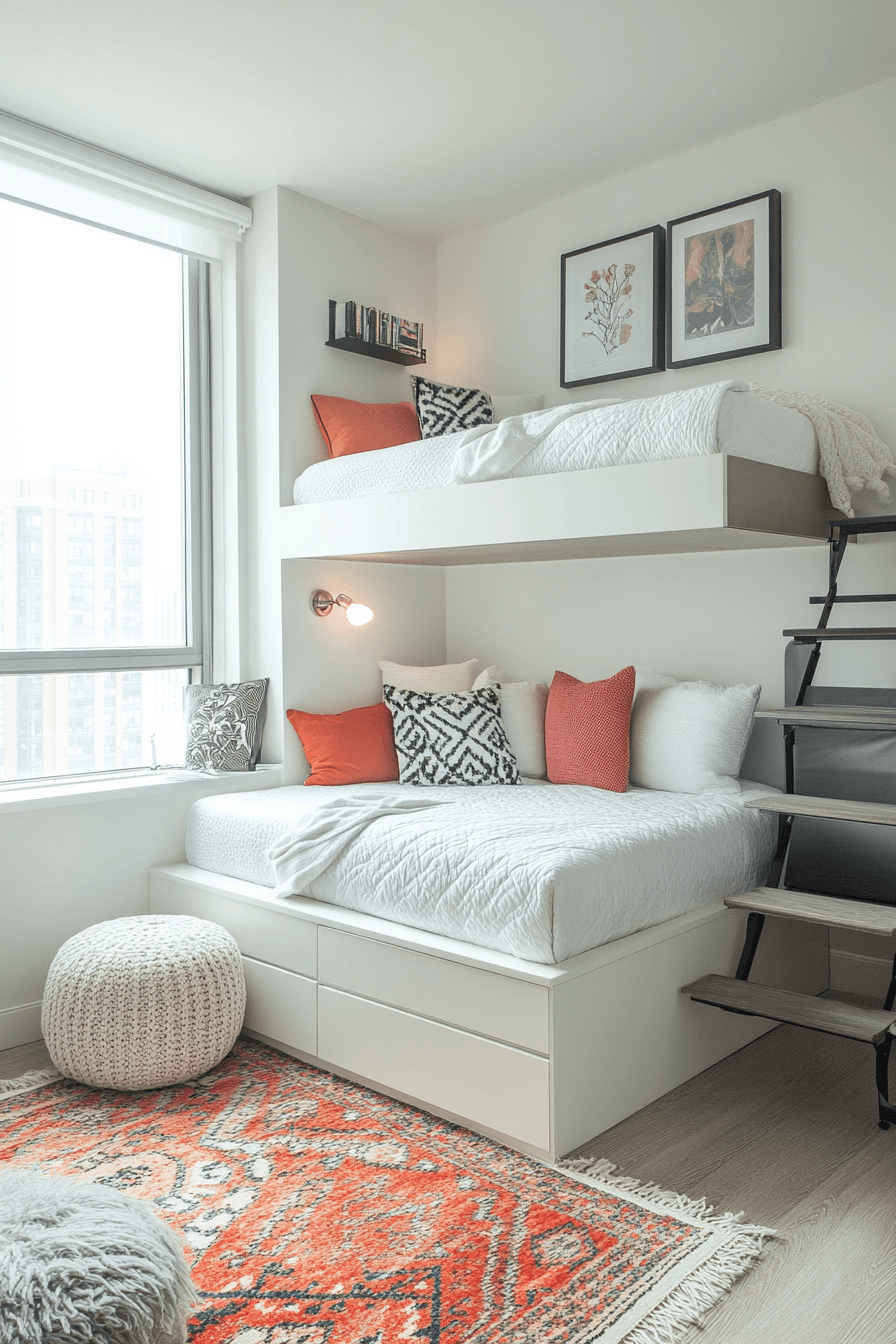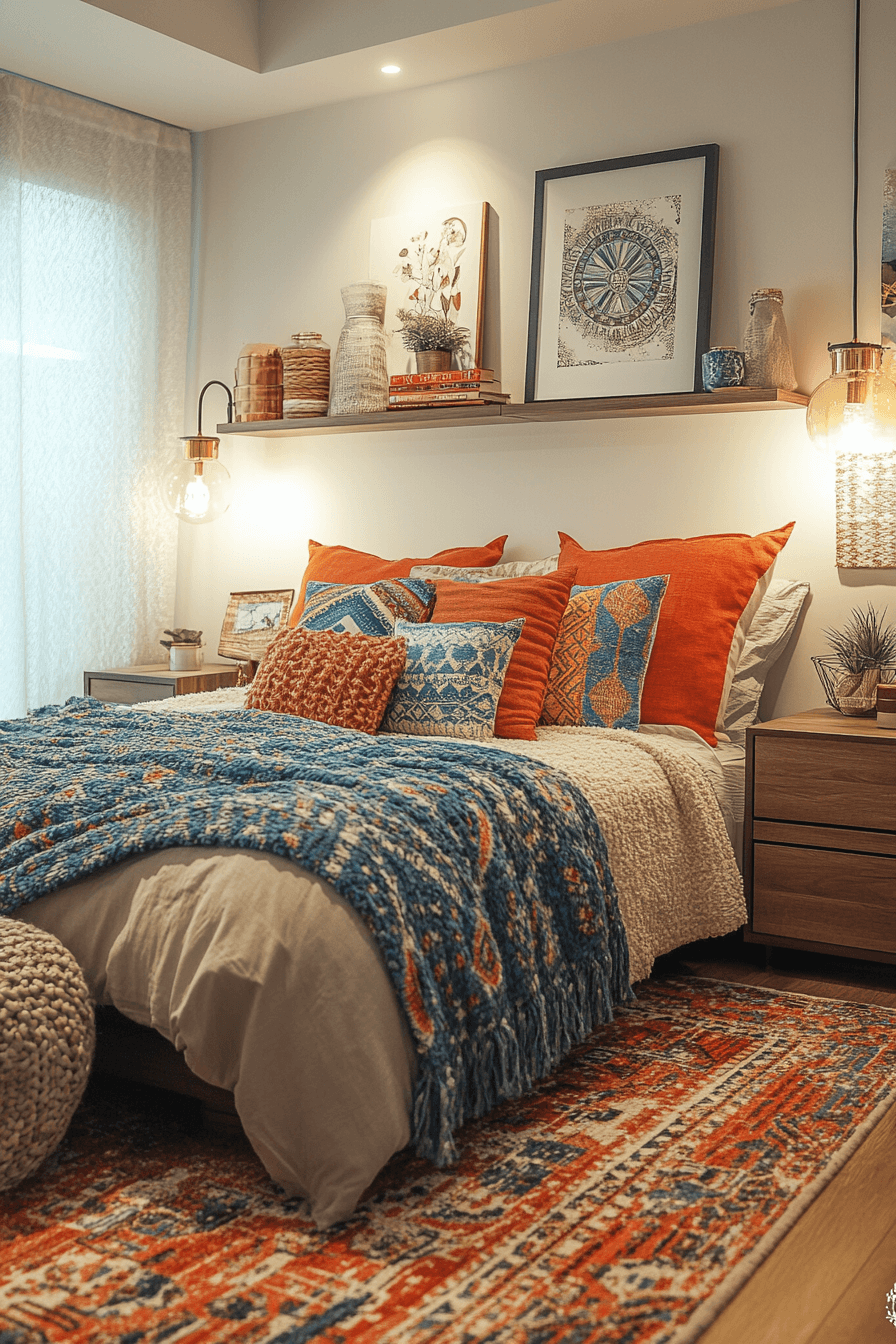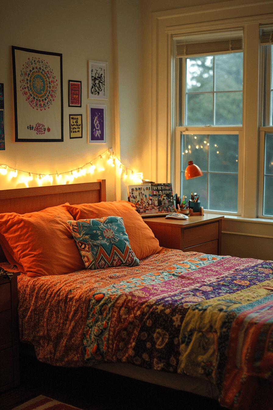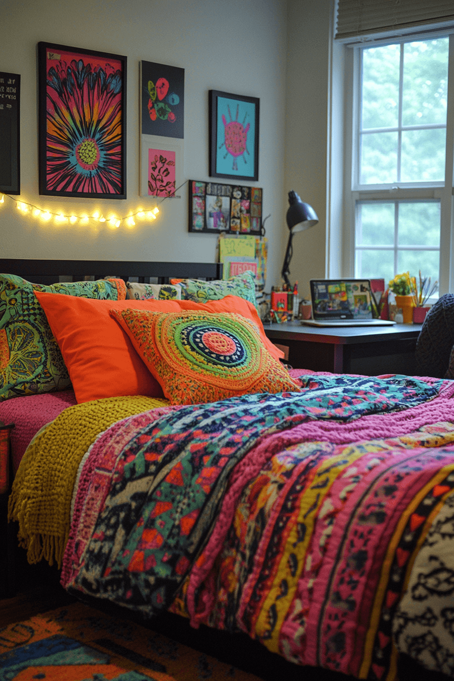 Mixing textures and colors creates visually exciting dorm room ideas full of personality. Layered rugs, patterned cushions, and vibrant bedding add depth to the design. Contrasting wall art enhances the creative atmosphere. Functional shelving keeps everything organized and stylish. This setup is perfect for expressing individuality. Tap to explore more artistic dorm inspiration.