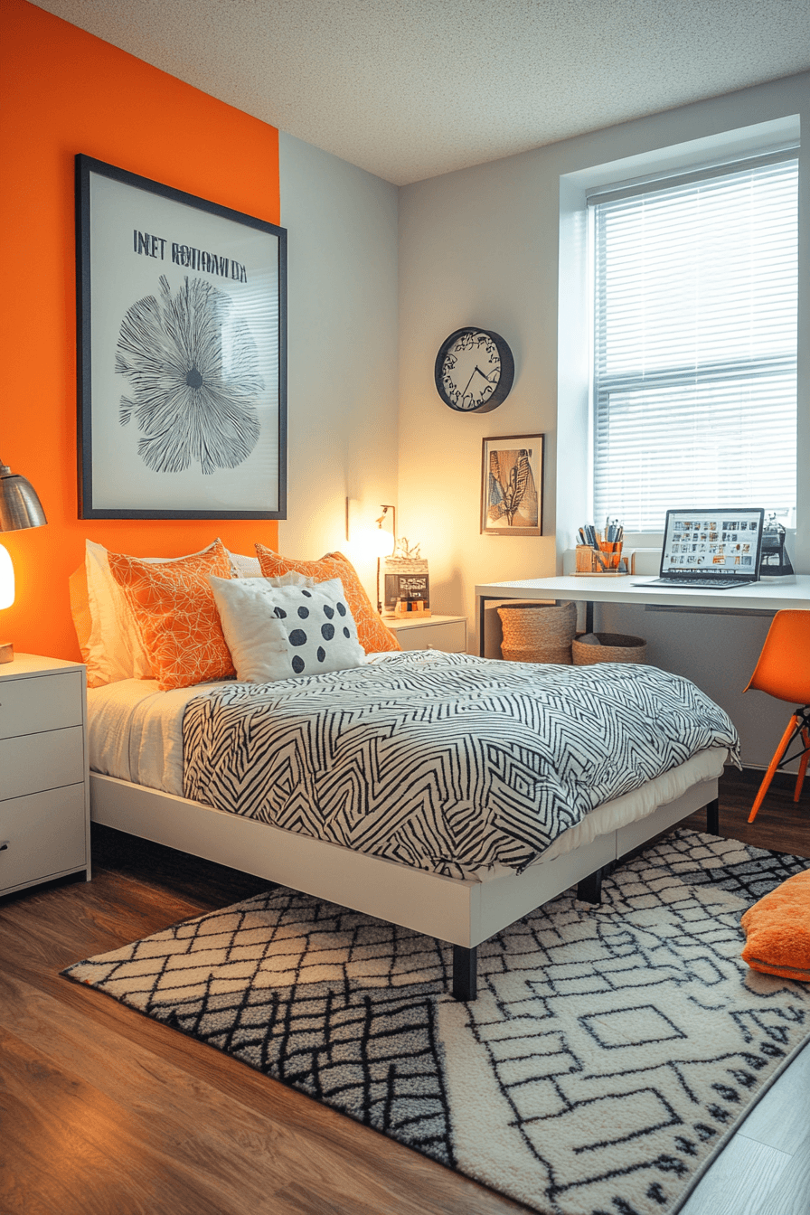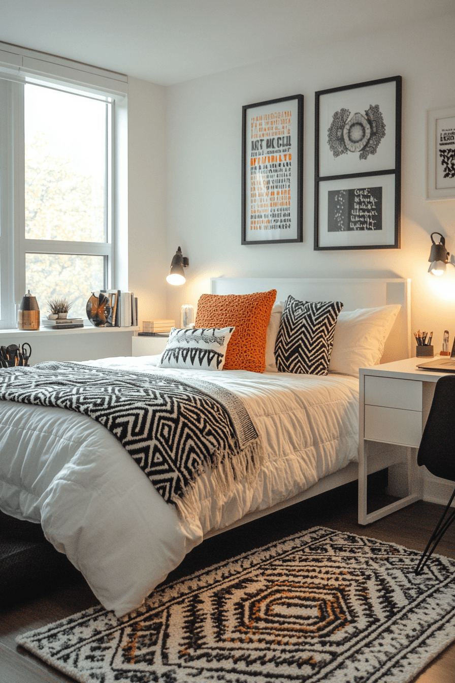A monochrome base with bold accents makes these dorm room ideas feel clean and modern. A single standout color keeps the design cohesive. Matching décor elements create a polished aesthetic. Unique lighting adds personality without clutter. The result is stylish and functional. Tap to explore more monochrome dorm ideas.