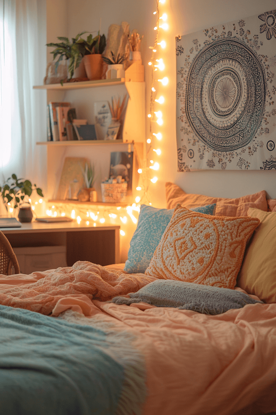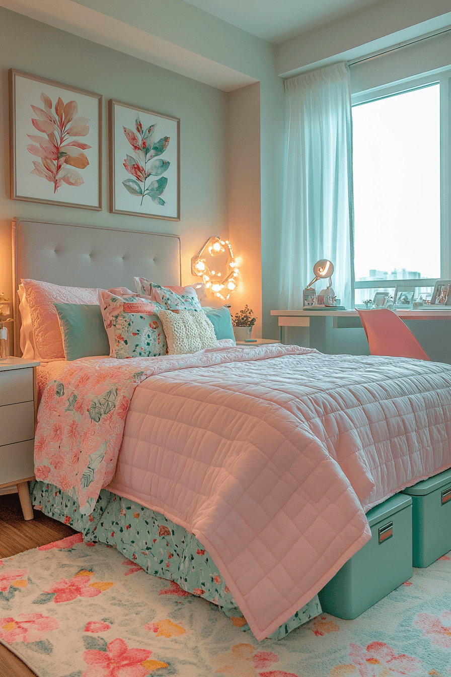 Refreshing sorbet tones make these dorm room ideas feel bright and uplifting. Soft pastels create a cheerful and inviting space. Coordinated décor keeps everything visually cohesive. Patterned rugs tie the entire design together. This setup feels playful yet relaxing. Discover more fresh dorm ideas now.