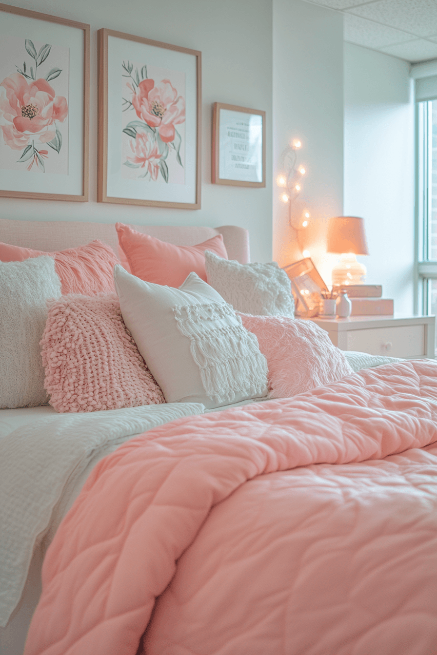 Soft pastel combinations create a calming yet playful vibe in these dorm room ideas. Gentle hues layered across bedding and décor bring warmth and comfort. Coordinated accents keep everything visually harmonious. Storage solutions blend seamlessly into the design. Ambient lighting adds a soft finishing touch. Discover more pastel dorm inspirations today.