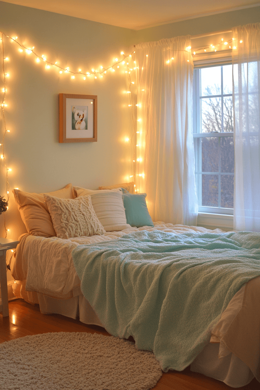Light and airy tones make these dorm room ideas feel spacious and uplifting. Soft yellows and cool blues create a refreshing palette. Minimal furniture keeps the layout open and functional. String lights add a cozy ambiance. The result is bright, cheerful, and relaxing. Discover more breezy dorm ideas now.