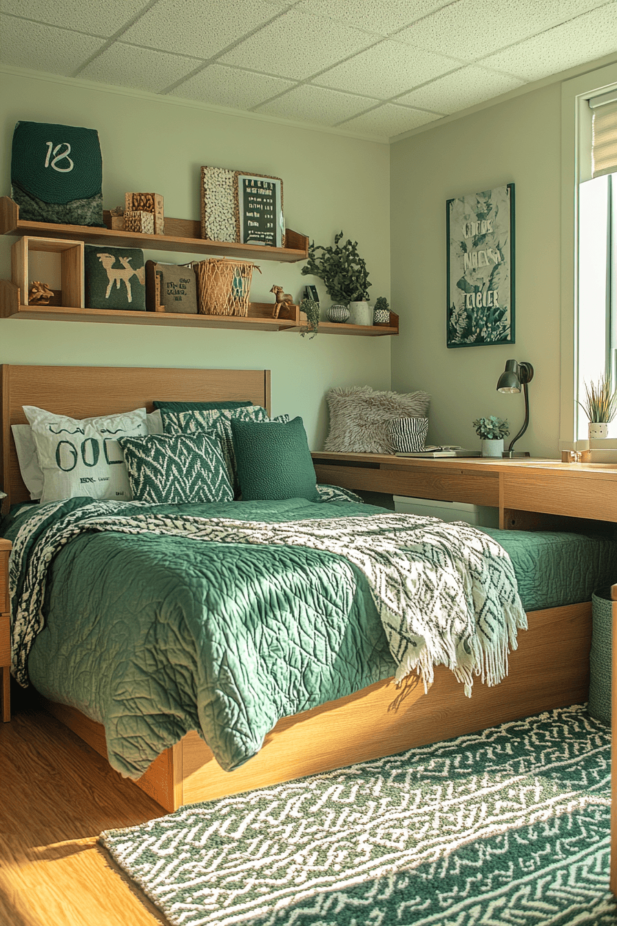 Jewel tones create rich and elegant dorm room ideas that feel elevated. Deep colors paired with plush textures add sophistication. Metallic finishes enhance the luxurious vibe. Thoughtful décor completes the dramatic look. The space feels both bold and inviting. Discover more jewel-tone dorm designs here.