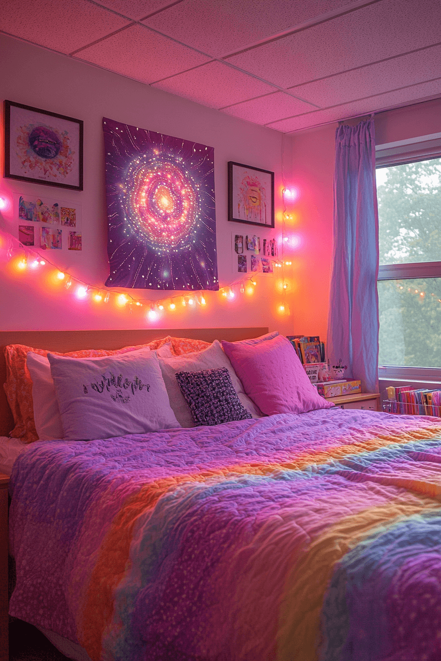A rainbow-inspired palette brings joyful energy to these dorm room ideas without feeling overwhelming. Multi-colored bedding sets the tone for a cheerful atmosphere. Gradient wall décor enhances the playful aesthetic beautifully. Matching accessories keep everything coordinated and tidy. Warm lighting ties the entire look together with a cozy glow. Check out more colorful dorm designs here.