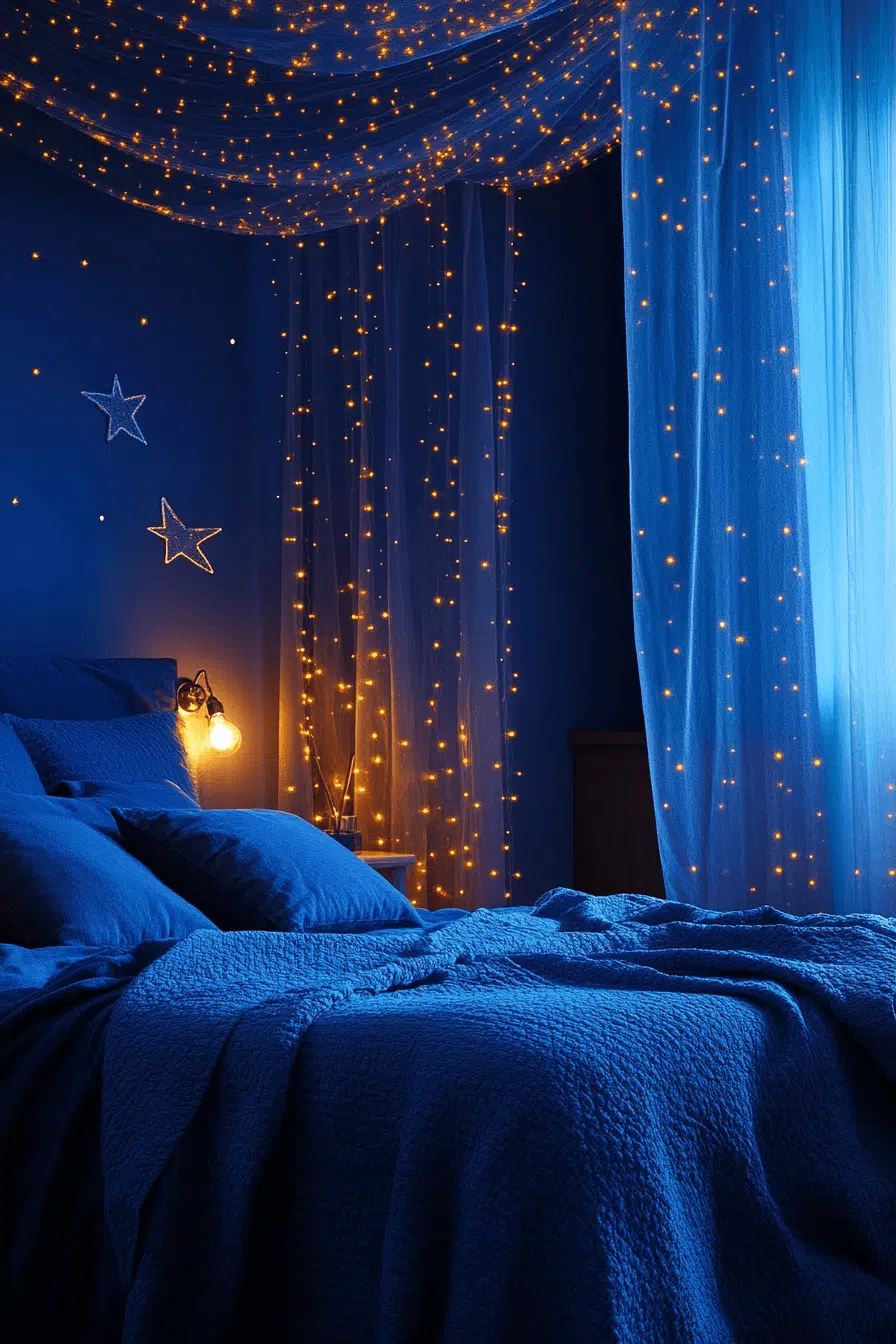 Glow in a Stellar Fairy Twinkle Hut, where fiber-optic stars light up the night, perfect for fairy bedroom ideas for kids. This starry retreat is easy with cheap lights and dark walls that make it pop. Soft bedding keeps it cozy under their personal sky.