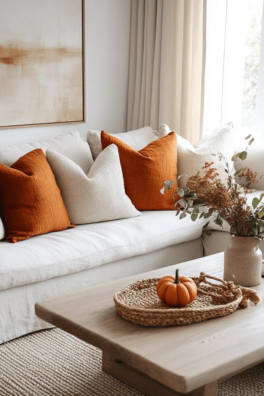 Add charming seasonal personality without overwhelming your layout. This fall apartment decor style highlights small pumpkin details that feel playful yet refined. Velvet pumpkins on shelves, ceramic accents on tables, or pumpkin-patterned textiles bring in autumn charm. These elements are easy to remove when the season changes. When balanced with neutral tones, the look feels thoughtful rather than themed. It is a budget-friendly way to celebrate fall in a small space.