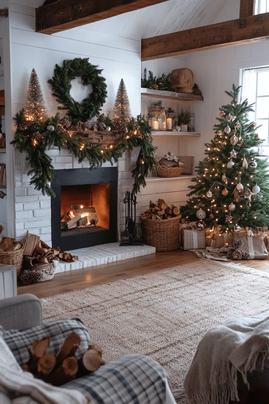 Woodsy farmhouse Christmas decor introduces natural logs, hand-carved accents, and cedar garlands into your home. Soft lighting highlights the warmth of natural grains and earthy textures. Wooden ornaments and nature-inspired figures add thoughtful detail. This grounded theme brings quiet charm and rustic elegance together seamlessly.