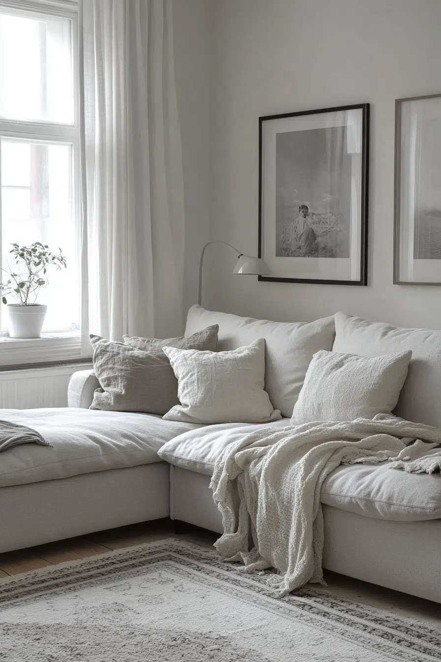 Glow in a Subtle Grey Charm, where soft greys and clean furniture craft a refined, easy look. This grey minimalist living room shines with cheap linen textures and a single vase that adds flair. Layered lights keep it warm without cluttering the vibe.