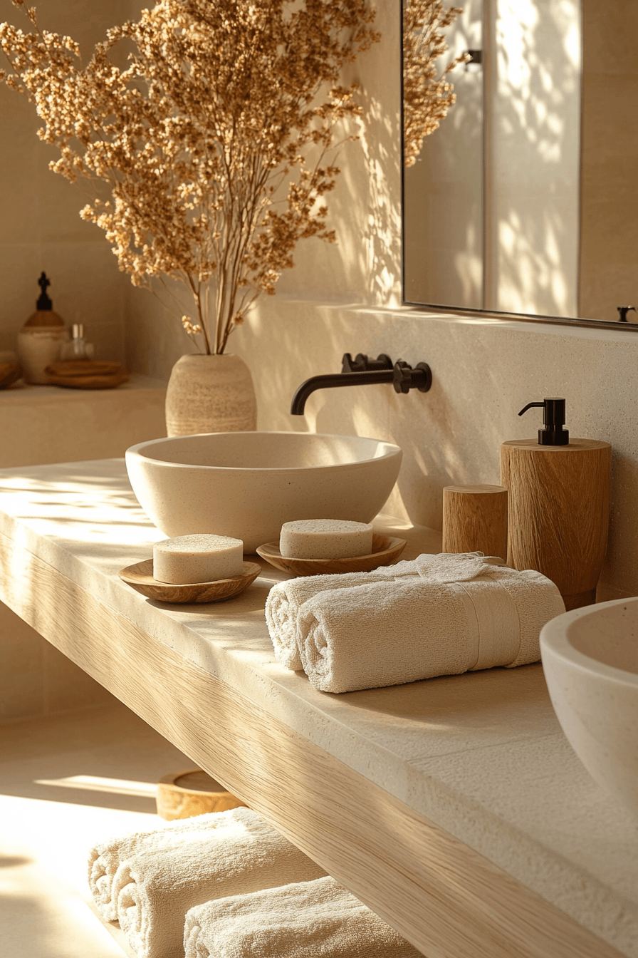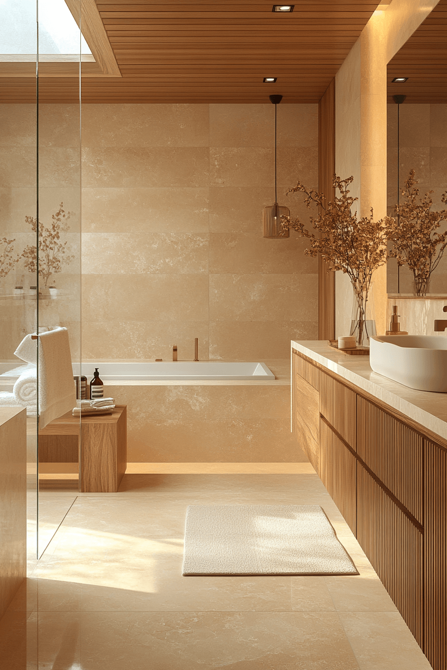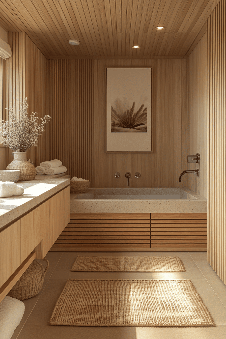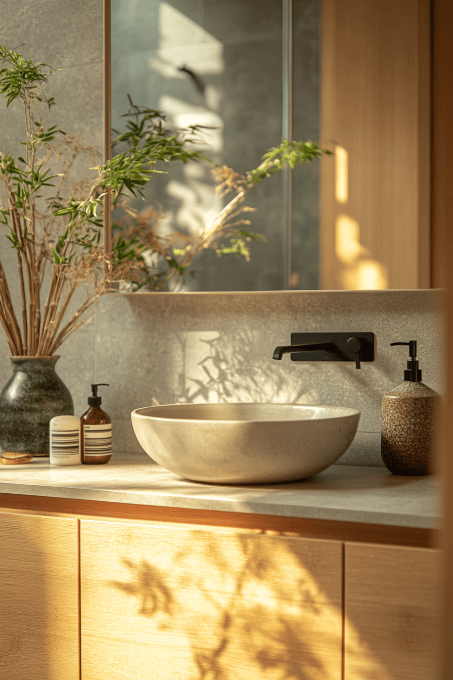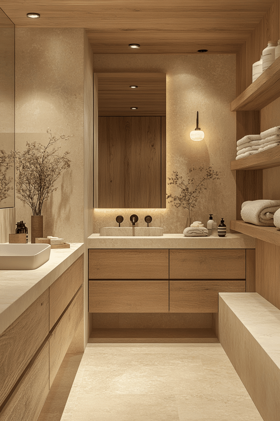 A warm and inviting mood shapes this japandi bathroom design with natural textures and soft finishes. Wooden cabinetry pairs with stone surfaces for a grounded feel. Subtle textiles enhance comfort while maintaining simplicity. Gentle lighting completes the relaxing ambiance. The space feels cozy and refined. Find more japandi bathroom design ideas with warm textures.