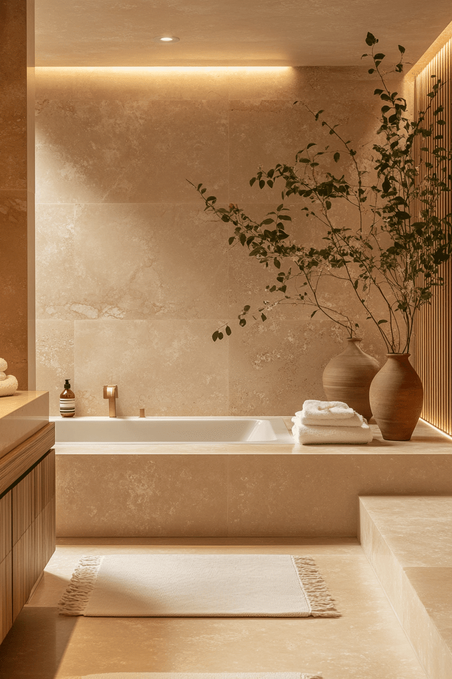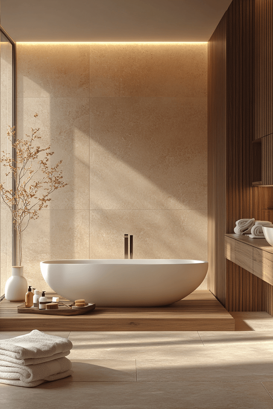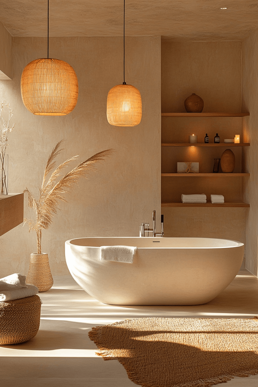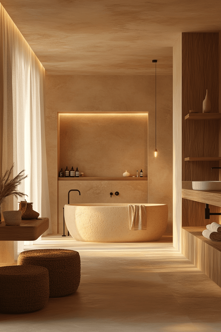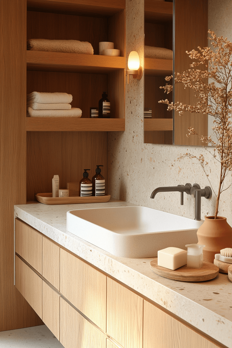 A warm and inviting mood shapes this japandi bathroom design with natural textures and soft finishes. Wooden cabinetry pairs with stone surfaces for a grounded feel. Subtle textiles enhance comfort while maintaining simplicity. Gentle lighting completes the relaxing ambiance. The space feels cozy and refined. Find more japandi bathroom design ideas with warm textures.