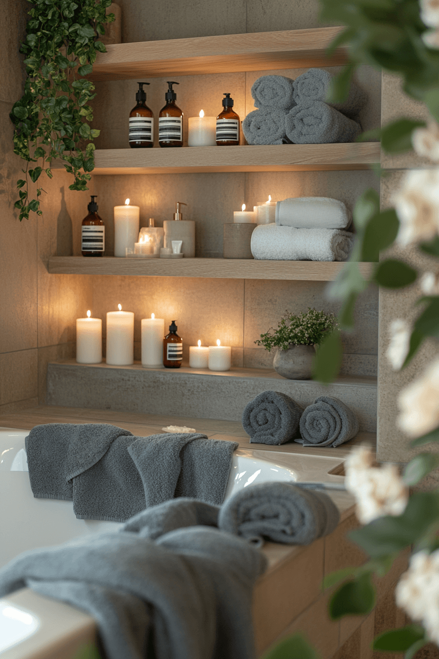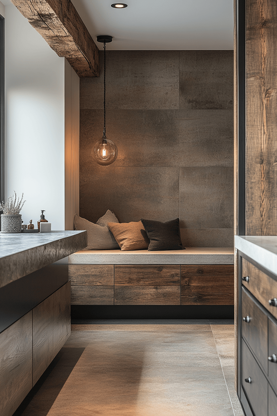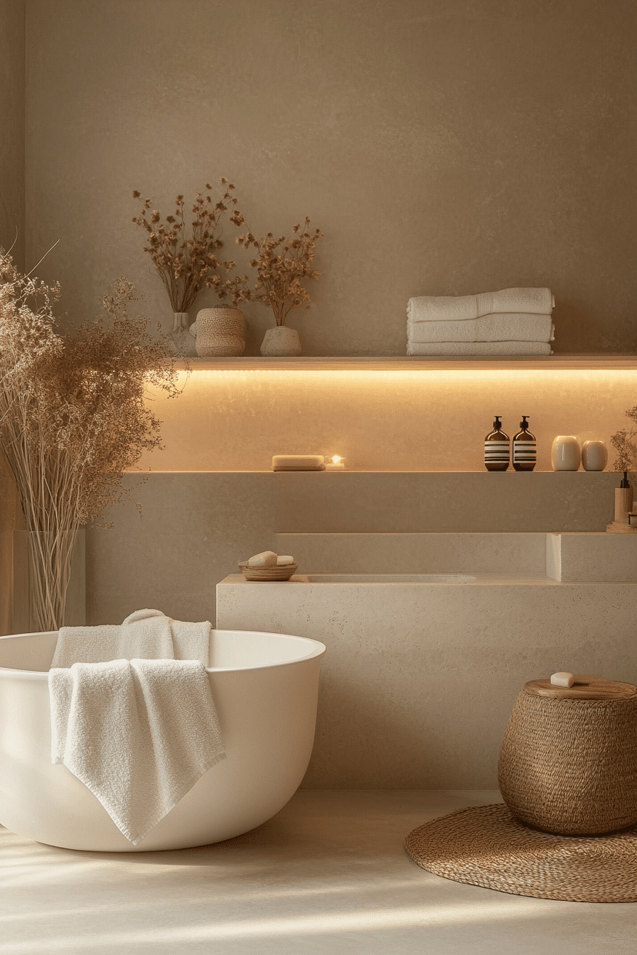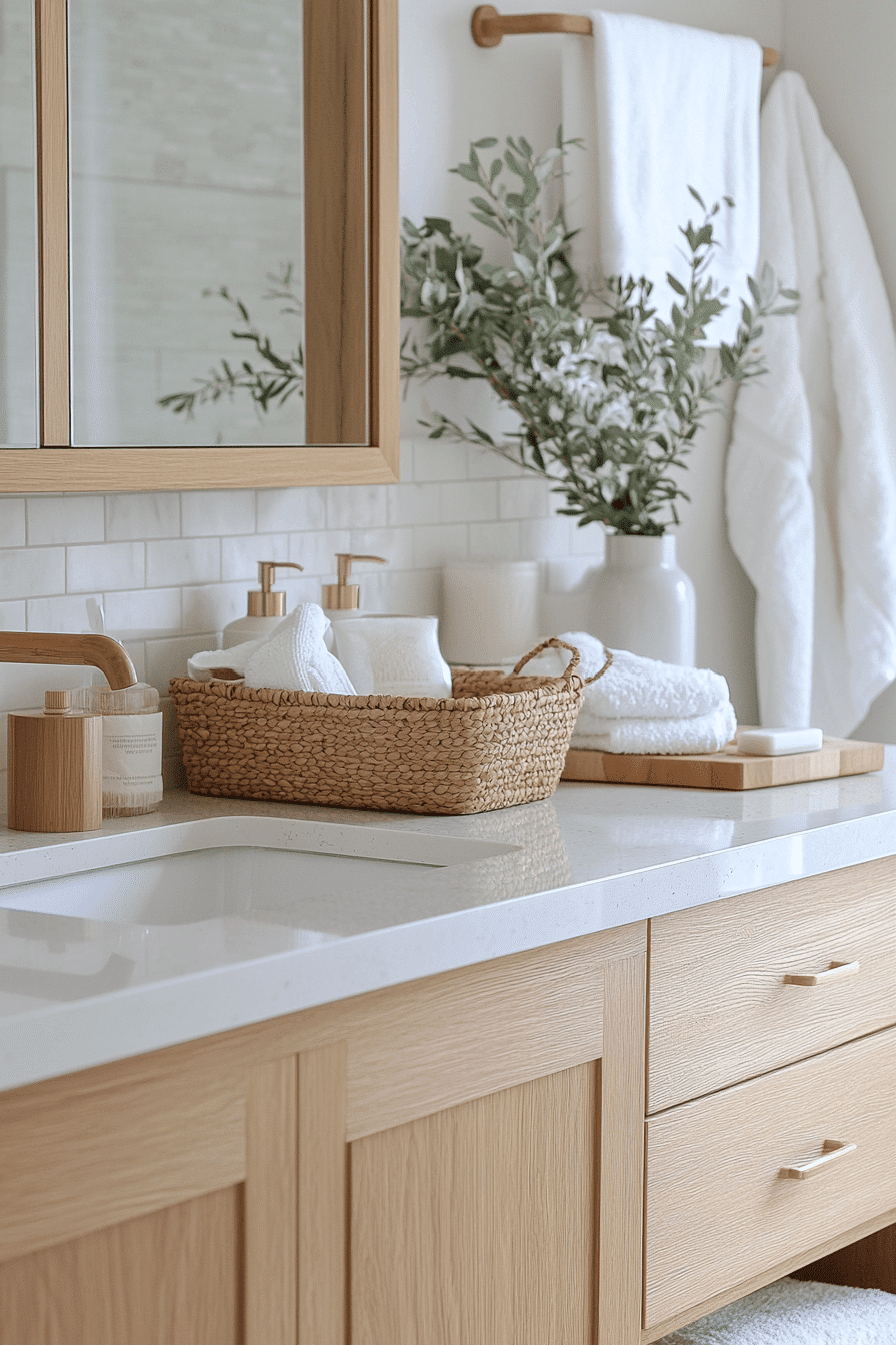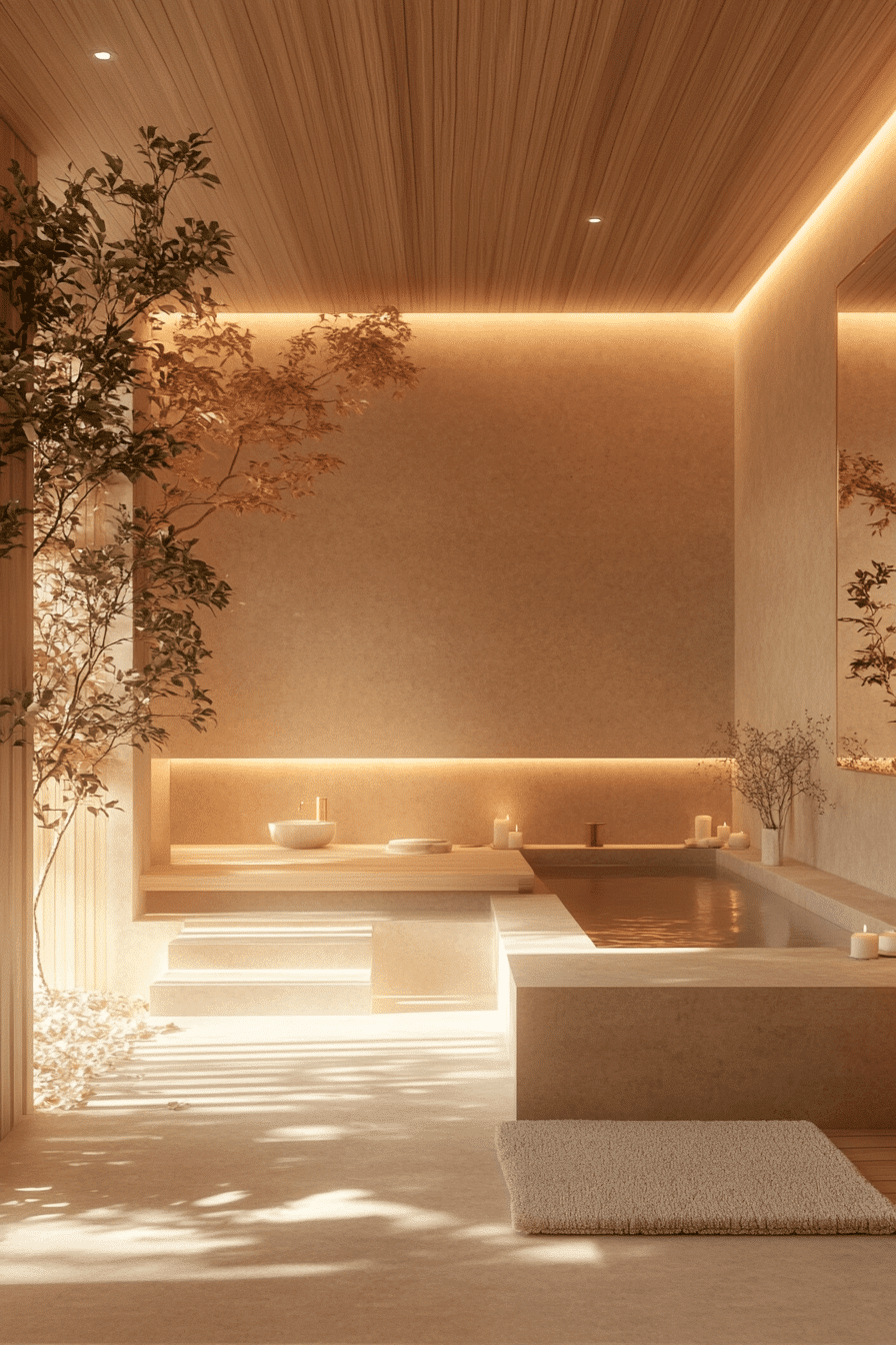 A warm and inviting mood shapes this japandi bathroom design with natural textures and soft finishes. Wooden cabinetry pairs with stone surfaces for a grounded feel. Subtle textiles enhance comfort while maintaining simplicity. Gentle lighting completes the relaxing ambiance. The space feels cozy and refined. Find more japandi bathroom design ideas with warm textures.
