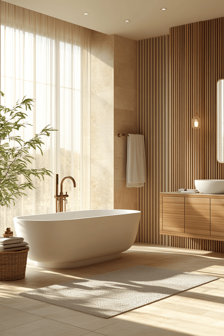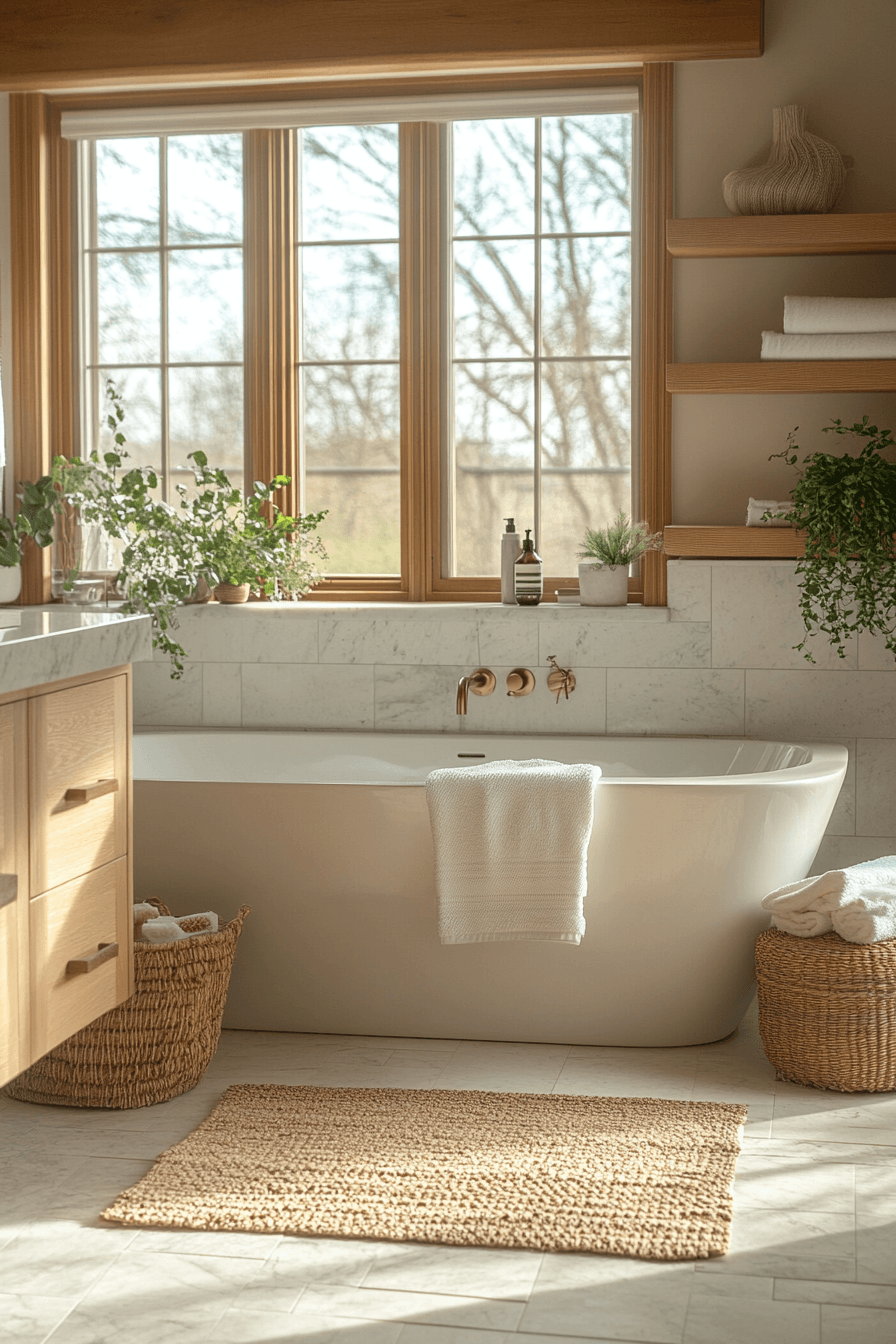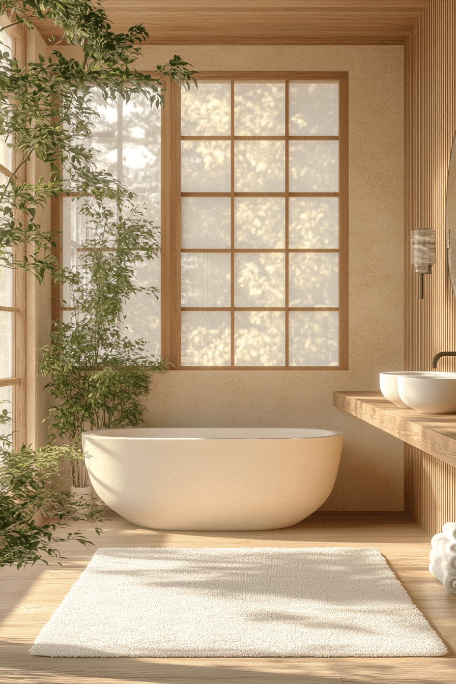 Natural light transforms this japandi bathroom design into a bright and refreshing retreat. Wide windows enhance openness and clarity. Light wood tones add warmth while maintaining simplicity. Minimal décor keeps the focus on materials and space. The atmosphere feels uplifting and calm. Discover more japandi bathroom design ideas with natural light.