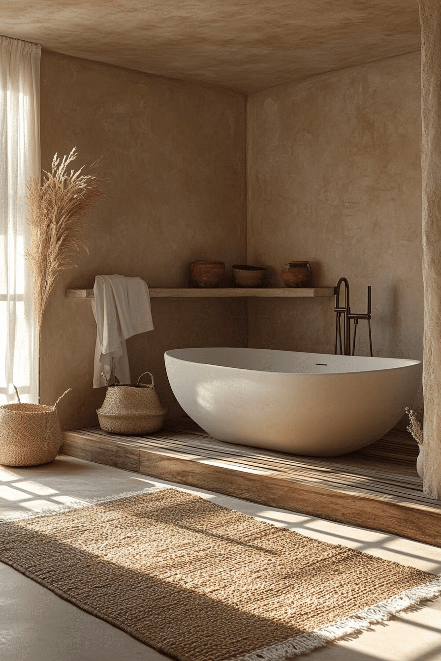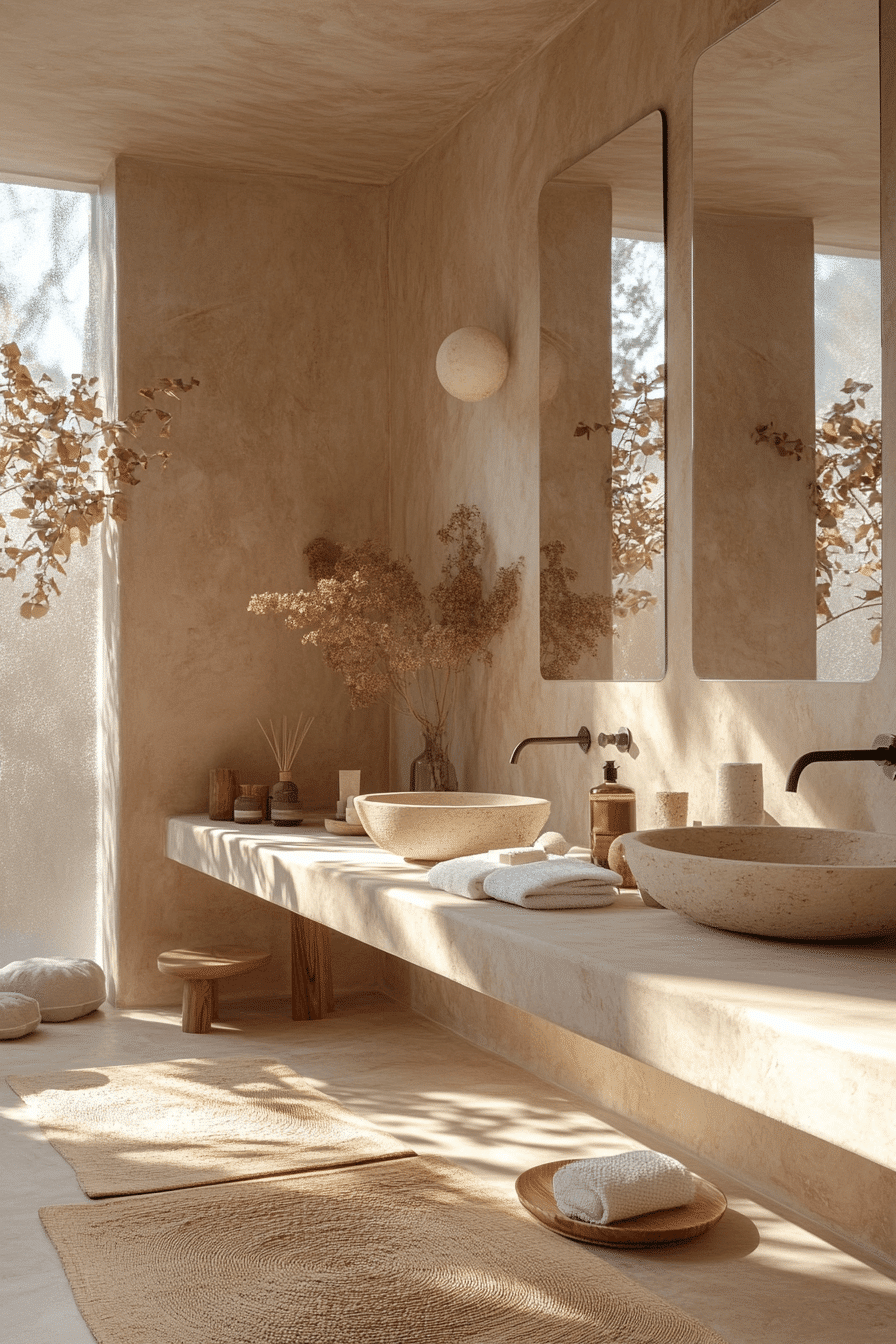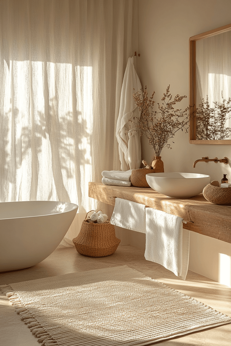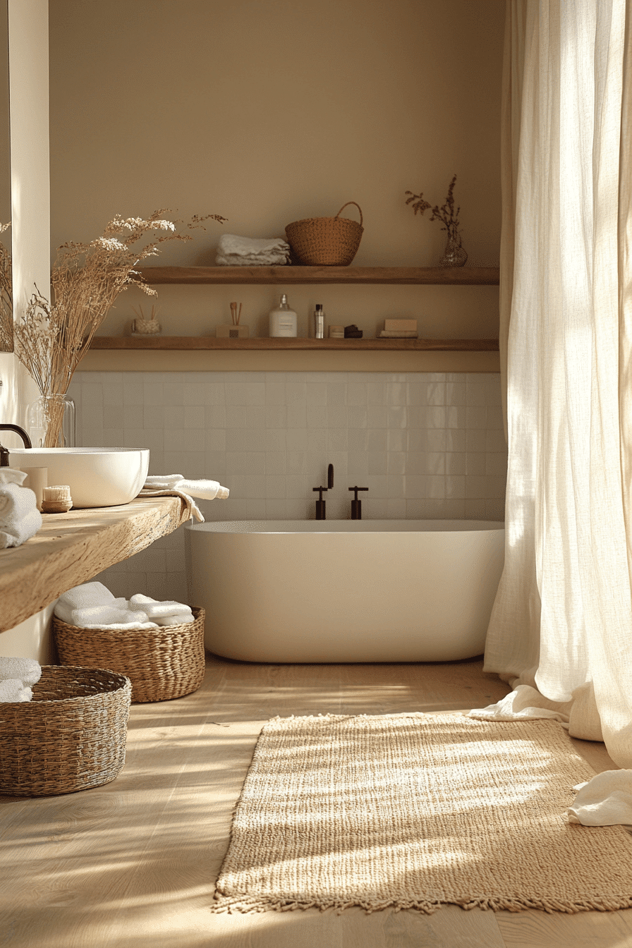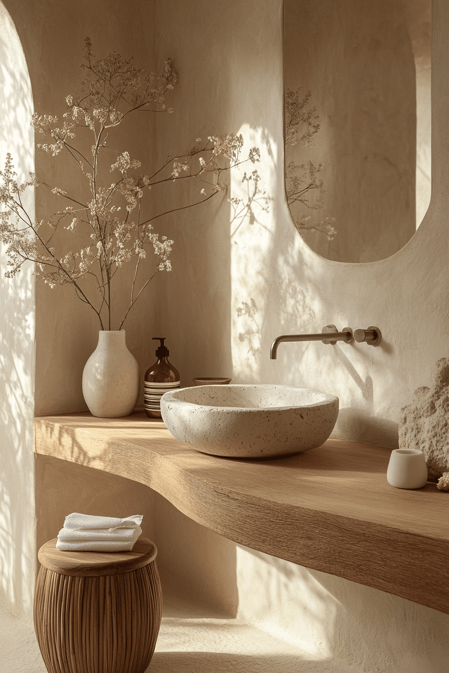 Organic elements define this japandi bathroom design with a strong connection to nature. Wood, stone, and linen textures create a spa-like environment. Neutral tones maintain visual calm throughout the space. Minimal layouts encourage relaxation and clarity. The result feels balanced and refreshing. Explore more japandi bathroom design ideas with organic influence.