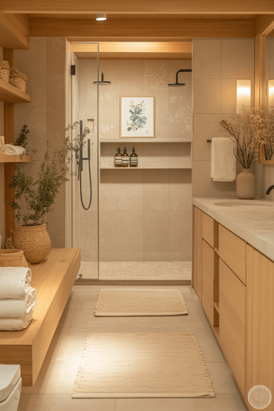 Minimal comfort defines this japandi bathroom design with soft textures and calming colors. Wood elements and muted tones create warmth and simplicity. Functional layouts maximize space and usability. Gentle lighting enhances relaxation. The design feels cozy and uncluttered. Explore more japandi bathroom design ideas with cozy minimalism.