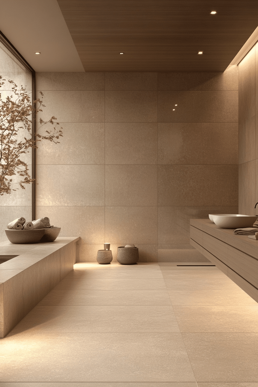 Warm neutrals create a welcoming atmosphere in this japandi bathroom design with soft contrasts and layered tones. Beige, sand, and gray hues blend seamlessly for a calming effect. Wooden accents add depth and natural warmth. Subtle textures enhance sophistication without overwhelming the space. The design feels versatile and timeless. Discover more japandi bathroom design ideas with neutral palettes.