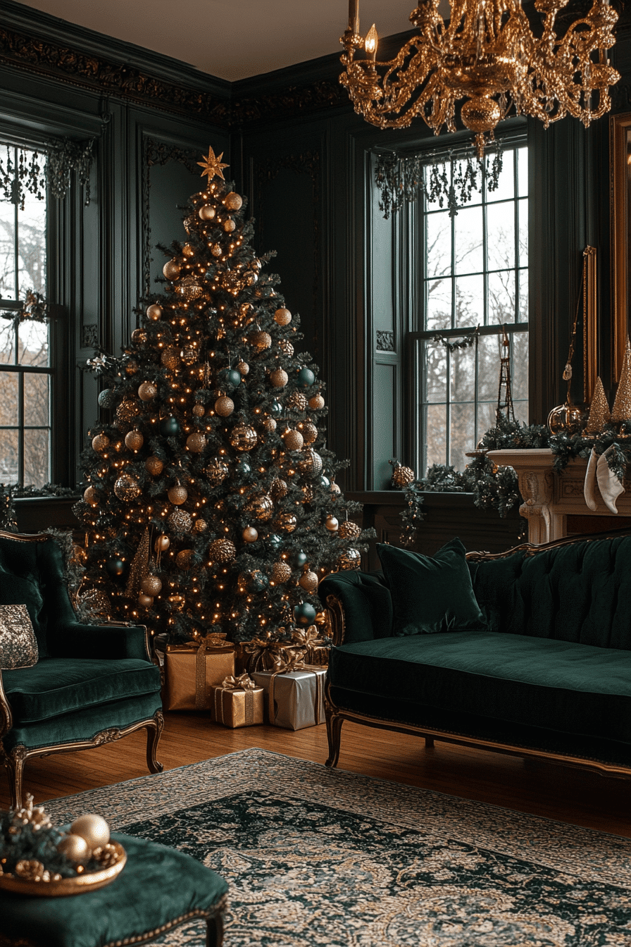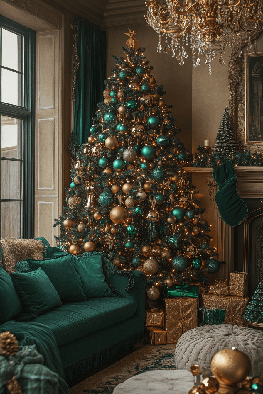 Emerald green fills jewel tone Christmas decor with refreshing elegance and timeless charm. The deep green shade pairs beautifully with shimmering gold details for a luxurious holiday palette. Its rich tone echoes the beauty of evergreen branches and winter forests. Emerald ornaments, garlands, and ribbons instantly elevate your festive styling. The gemstone-like glow makes every corner feel regal and magical. Click to discover more emerald-inspired jewel tone Christmas decor ideas.