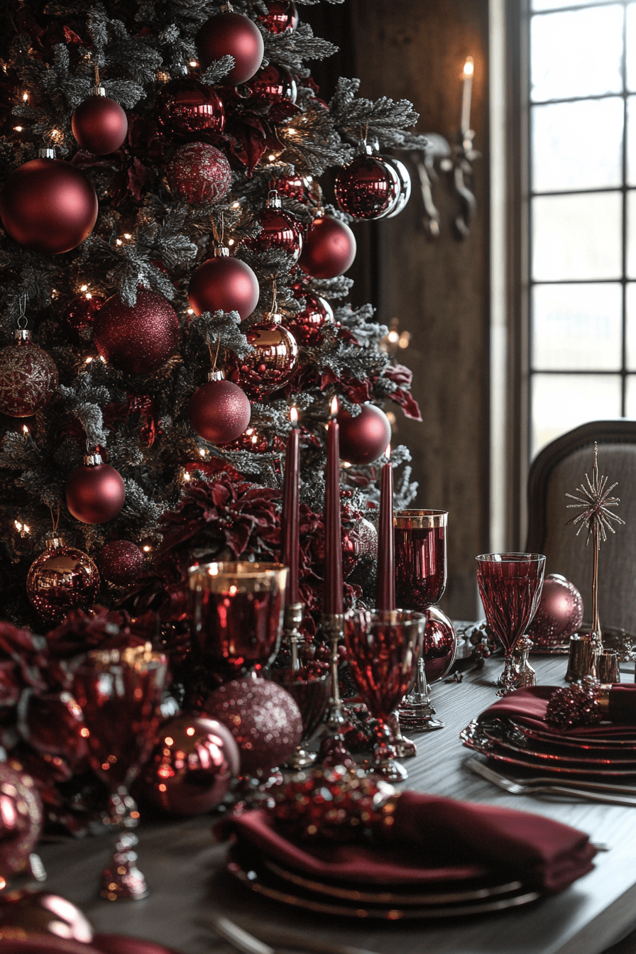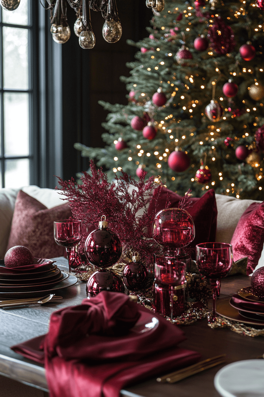 Garnet shades add cozy depth to jewel tone Christmas decor, bringing warmth and richness to your holiday palette. The deep red hue pairs beautifully with bronze, copper, or gold finishes. Garnet ornaments and table accents create an inviting atmosphere for festive gatherings. Its earthy undertones make the decor feel grounded yet sophisticated. This color balances brighter jewel tones effortlessly. Tap to discover more garnet-inspired jewel tone Christmas decor ideas.