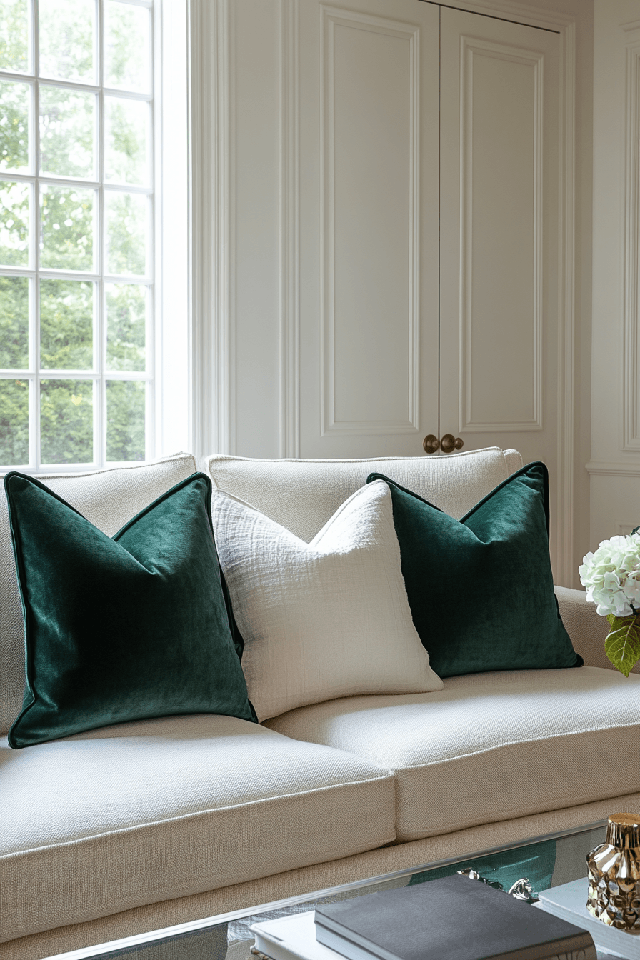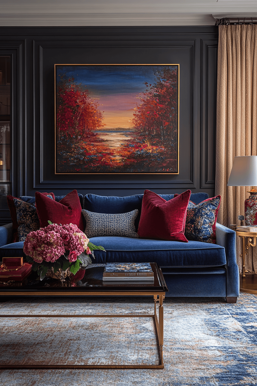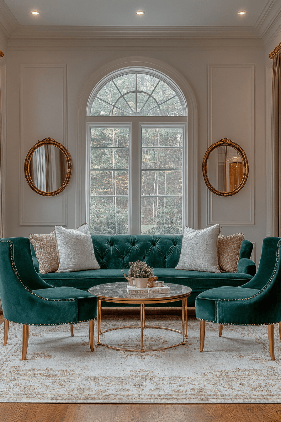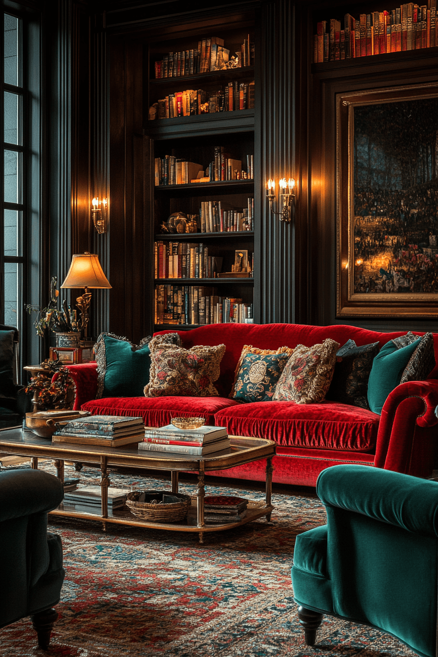 A jewel tone living room styled with velvet instantly feels rich, cozy, and inviting. Emerald or sapphire velvet sofas add luxurious texture while bringing vibrant color into the space. Pairing these bold hues with soft neutral walls keeps the design balanced and refined. Gold or brass lighting fixtures add warmth and enhance the jewel tones beautifully. A plush rug in coordinating shades ties the entire room together effortlessly. Tap to explore more velvet-inspired jewel tone living room ideas.