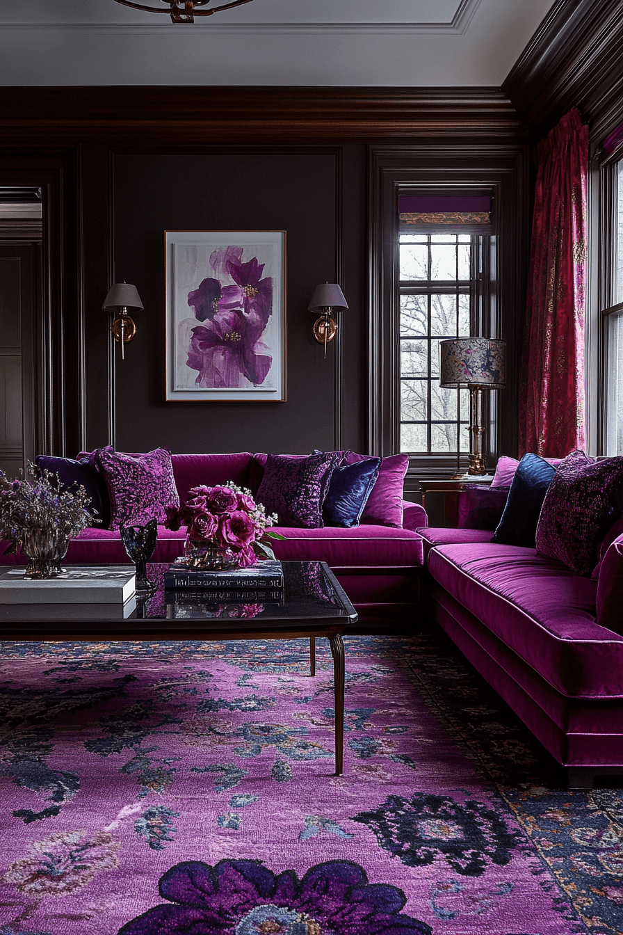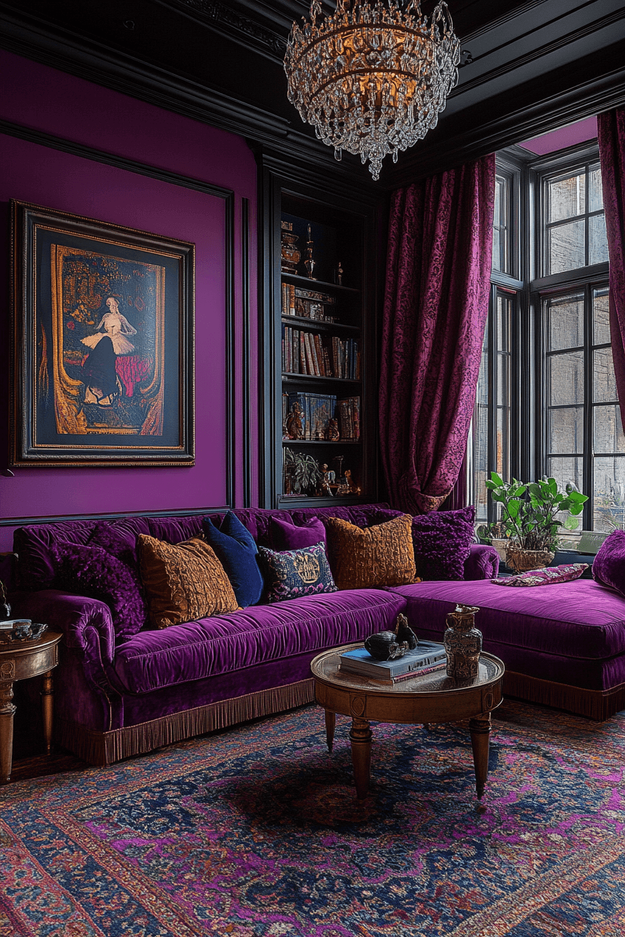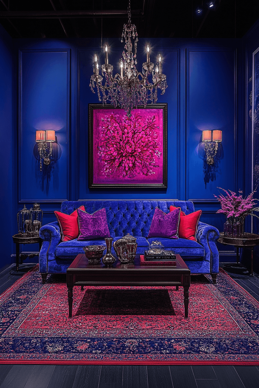 A jewel tone living room designed with royal flair embraces bold color and sophisticated details. Deep sapphire or amethyst walls create a dramatic foundation for the room. Plush seating in coordinating jewel shades adds comfort with high-end style. Metallic accents such as gold frames or sculptural tables elevate the space. Statement artwork featuring multiple jewel tones ties the design together. Tap to see more royal jewel tone living room ideas.