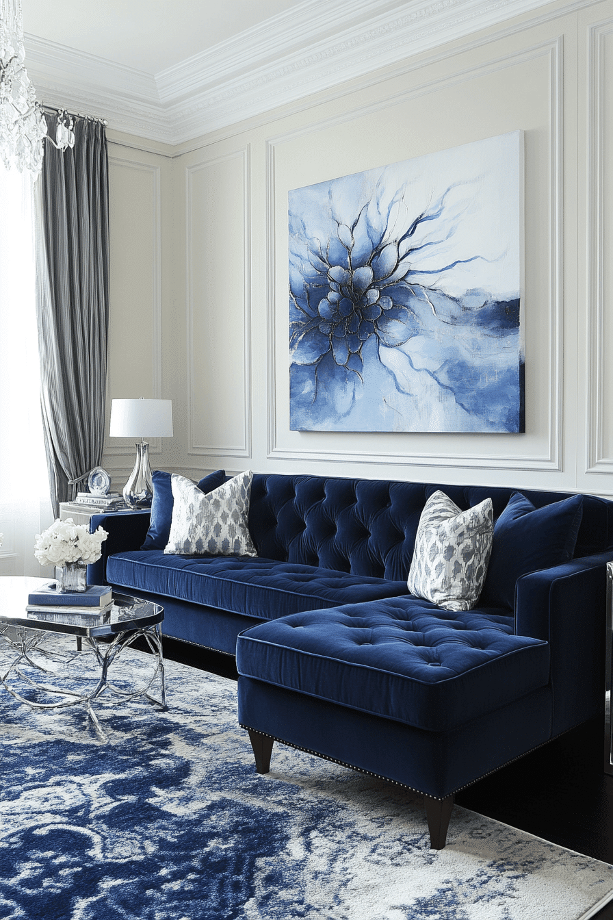 A sapphire-inspired jewel tone living room offers a sleek and modern approach to bold color. Deep blue seating brings richness while neutral walls keep the room feeling open. Chrome or silver accents add a contemporary touch to the palette. A sapphire rug can ground the design beautifully. Layered lighting ensures the color remains bright and inviting. Tap to see more sapphire-themed jewel tone living room ideas.