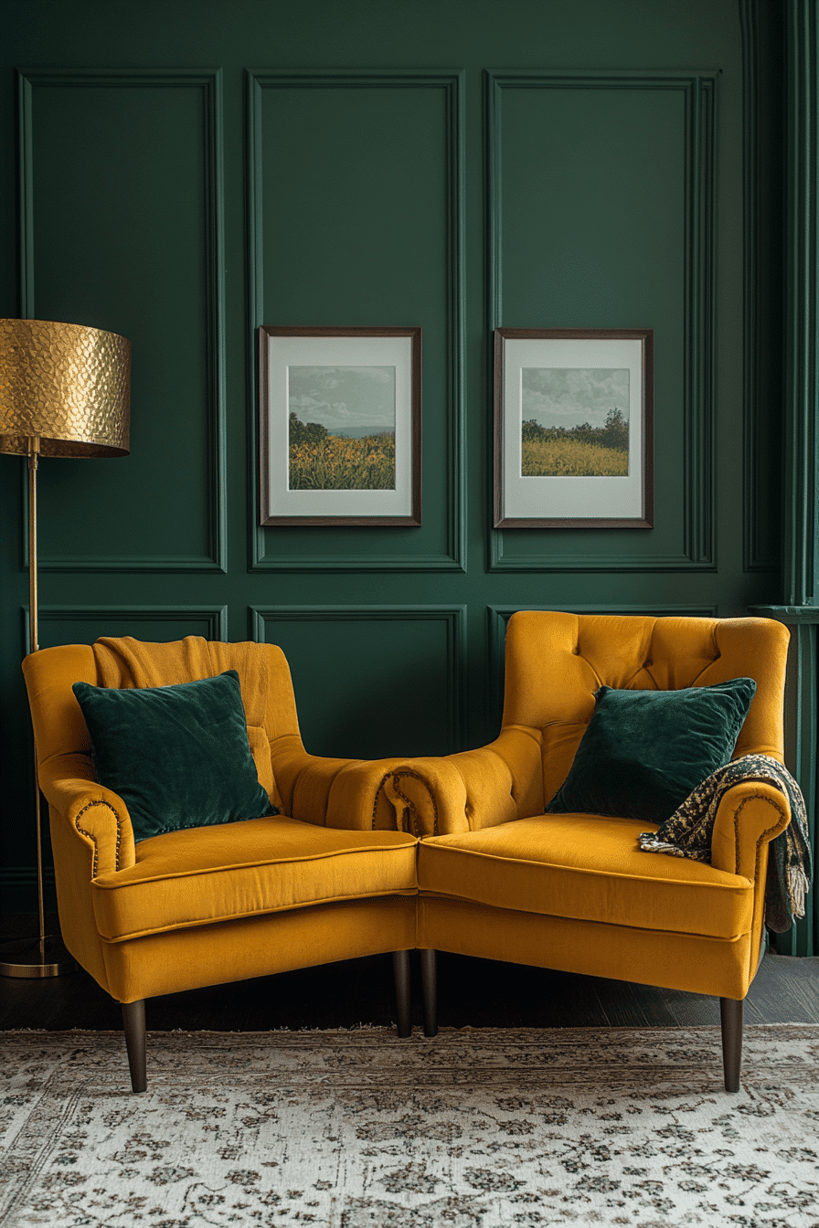 Citrine tones can brighten a colorful jewel tone living room with cheerful warmth. The golden yellow shade balances cooler hues like emerald and sapphire beautifully. It introduces brightness without overpowering the palette. Neutral elements keep the space feeling fresh. Accent lighting highlights the warmth of the color. Click to explore more citrine-inspired jewel tone living room ideas.