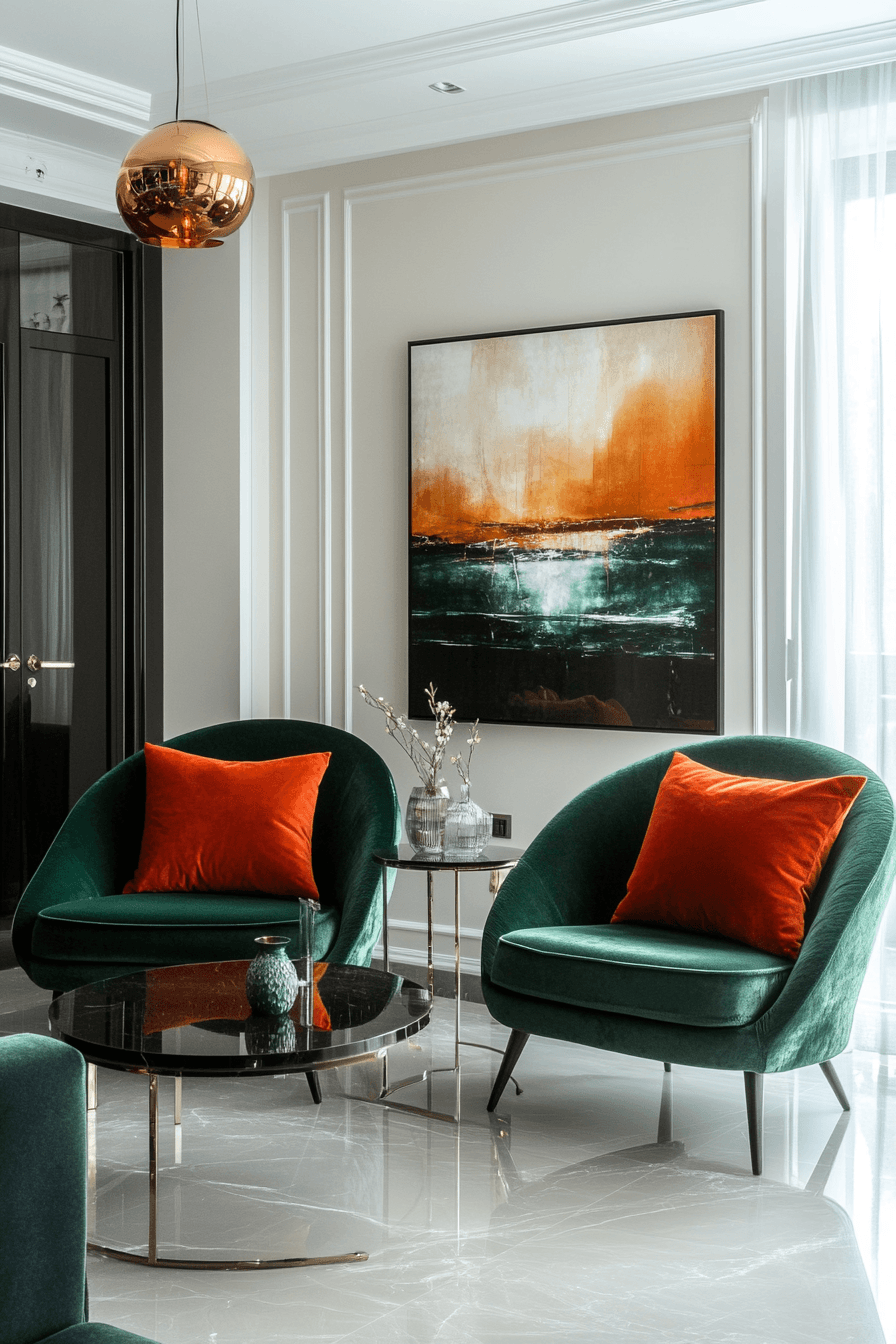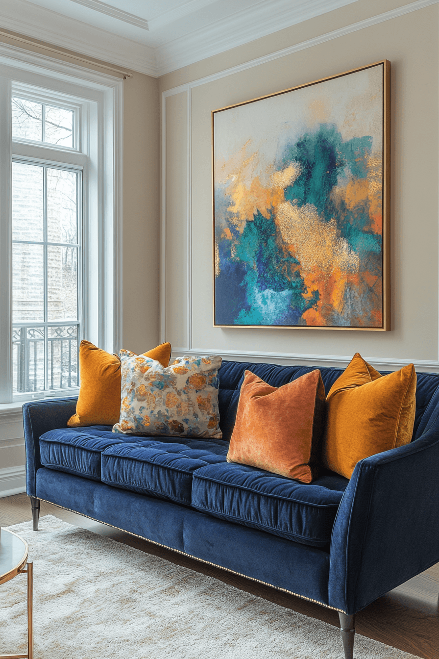 Amber accents introduce warmth and glow within a vibrant jewel tone living room palette. Amber-toned furniture or rugs complement cooler shades such as emerald and sapphire beautifully. The warm hues create balance within the color scheme. Gold lighting enhances the amber glow while maintaining elegance. Neutral decor helps unify the palette seamlessly. Click to discover more amber-inspired jewel tone living room looks.