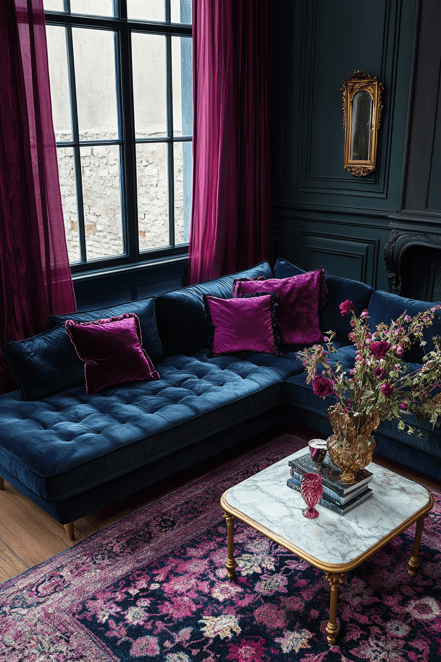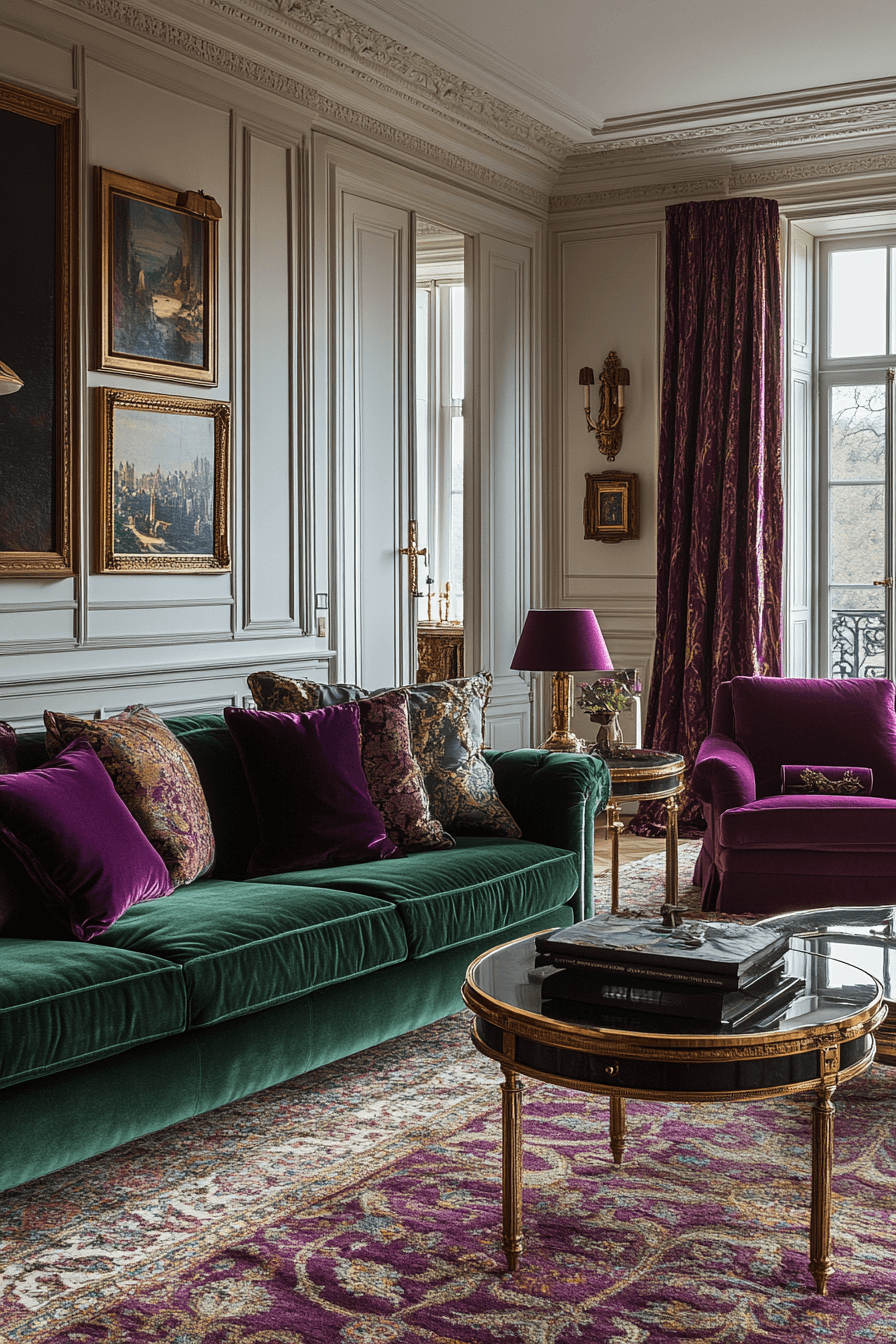A jewel tone living room can also blend luxury with modern minimalism. Sapphire sofas paired with emerald chairs create a striking yet balanced palette. Sleek glass or metal tables add a contemporary feel. Neutral walls allow the jewel colors to shine. Keeping decor simple ensures the colors remain the focus. Click to see more modern jewel tone living room inspiration.