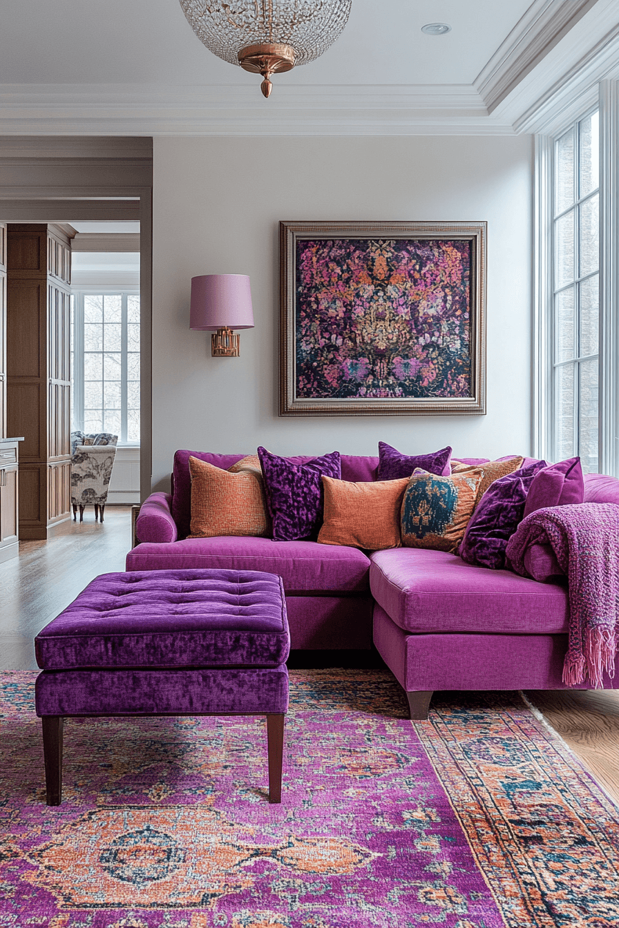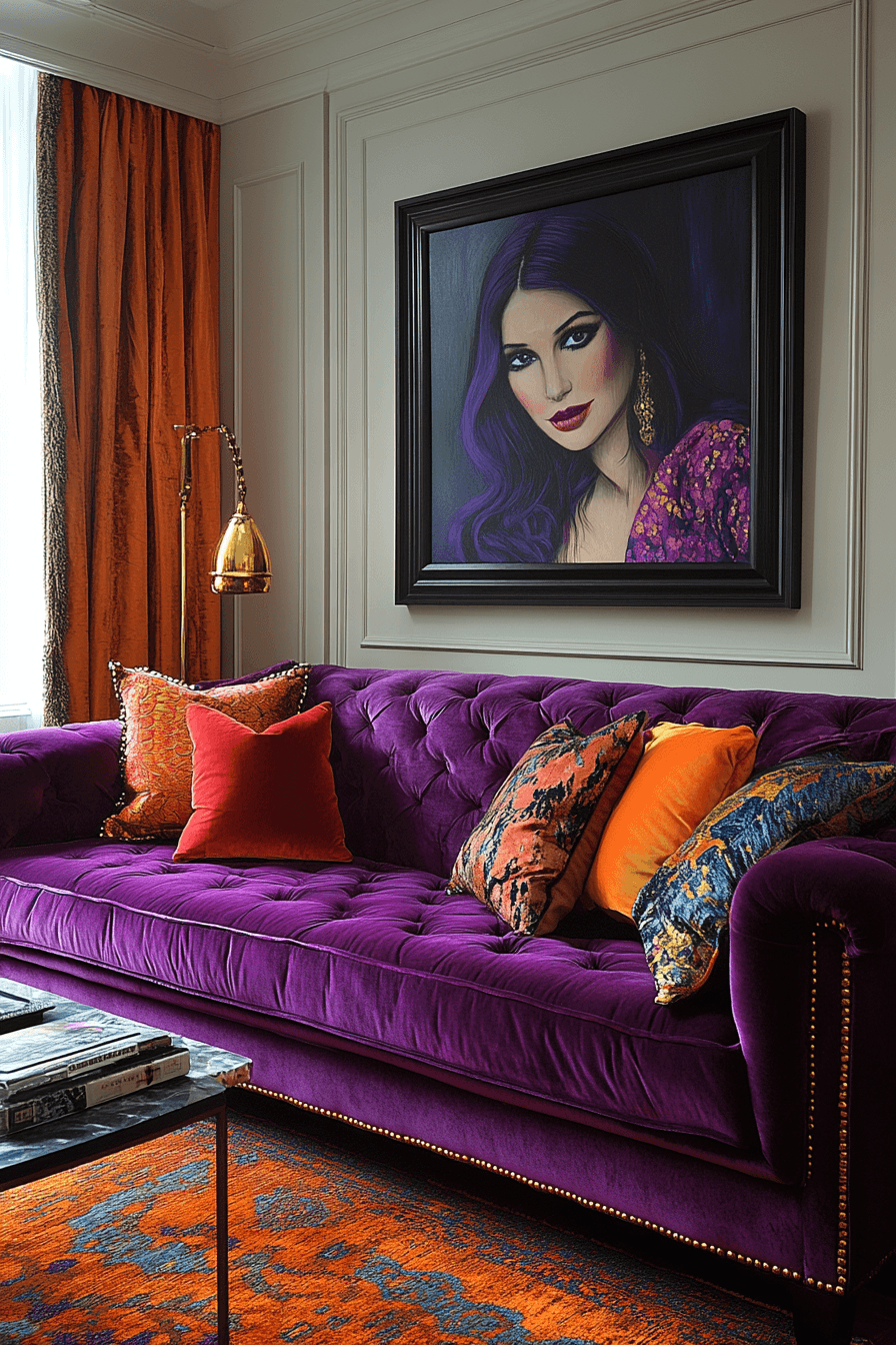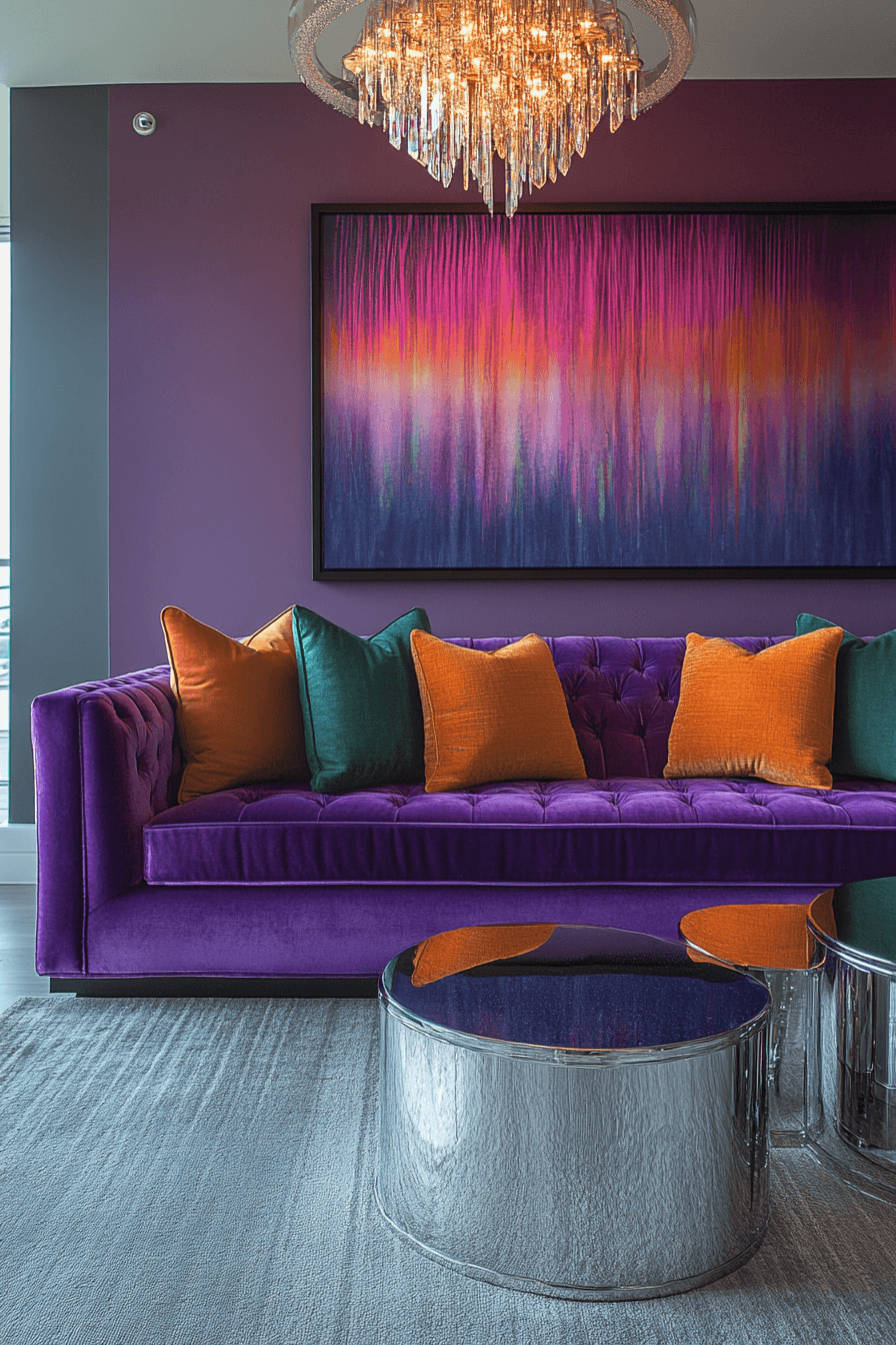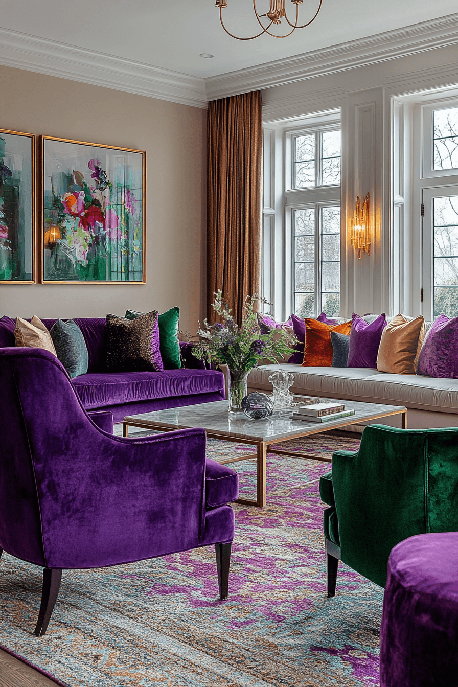 Combining rich jewel shades creates a majestic atmosphere within a jewel tone living room. Amethyst, emerald, and sapphire tones layered throughout upholstery and decor form a regal palette. Bronze or gold metallic details reinforce the luxurious mood. Rugs, curtains, and cushions in varied jewel tones add dimension. Large-scale artwork completes the dramatic look. Tap to explore more majestic jewel tone living room ideas.