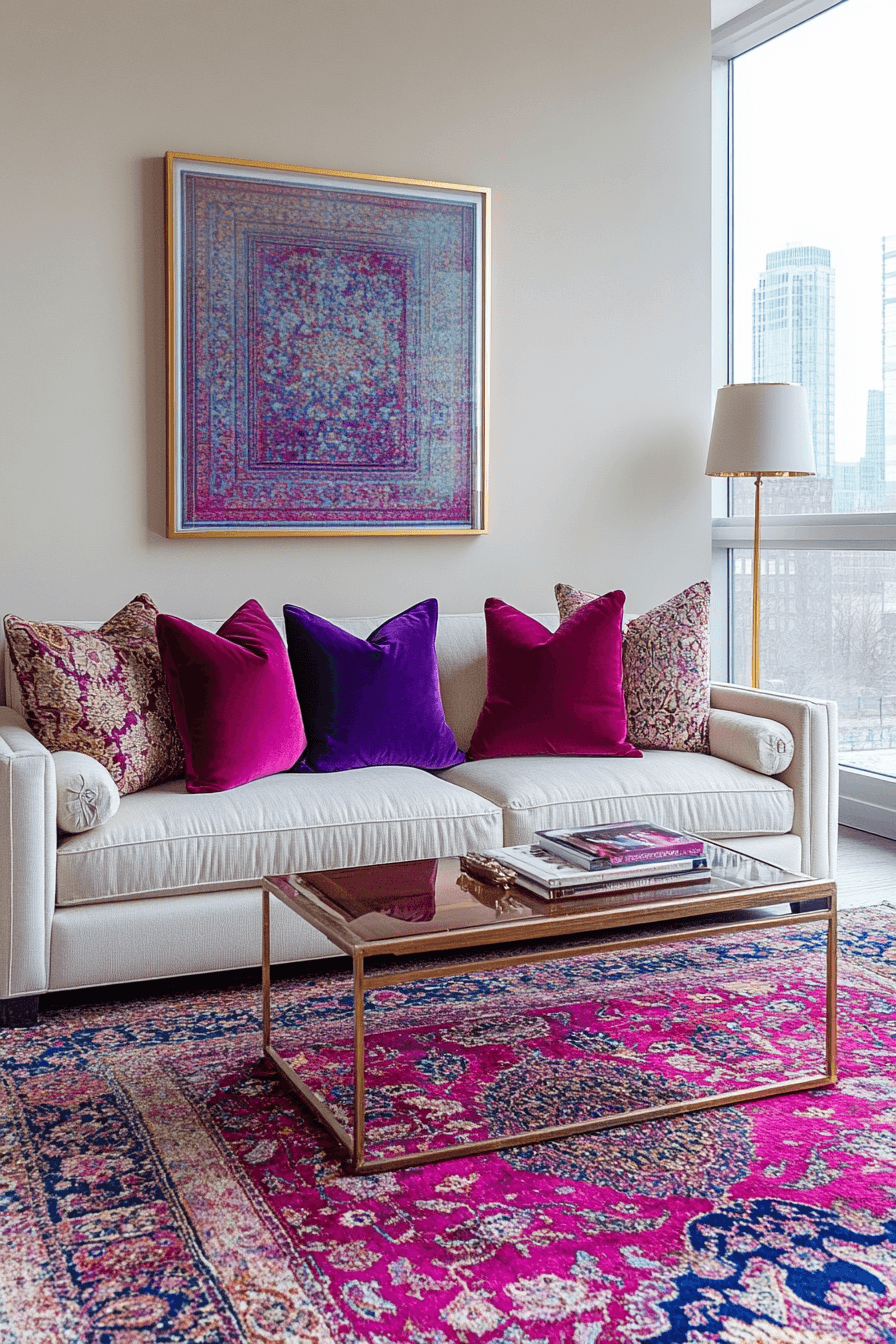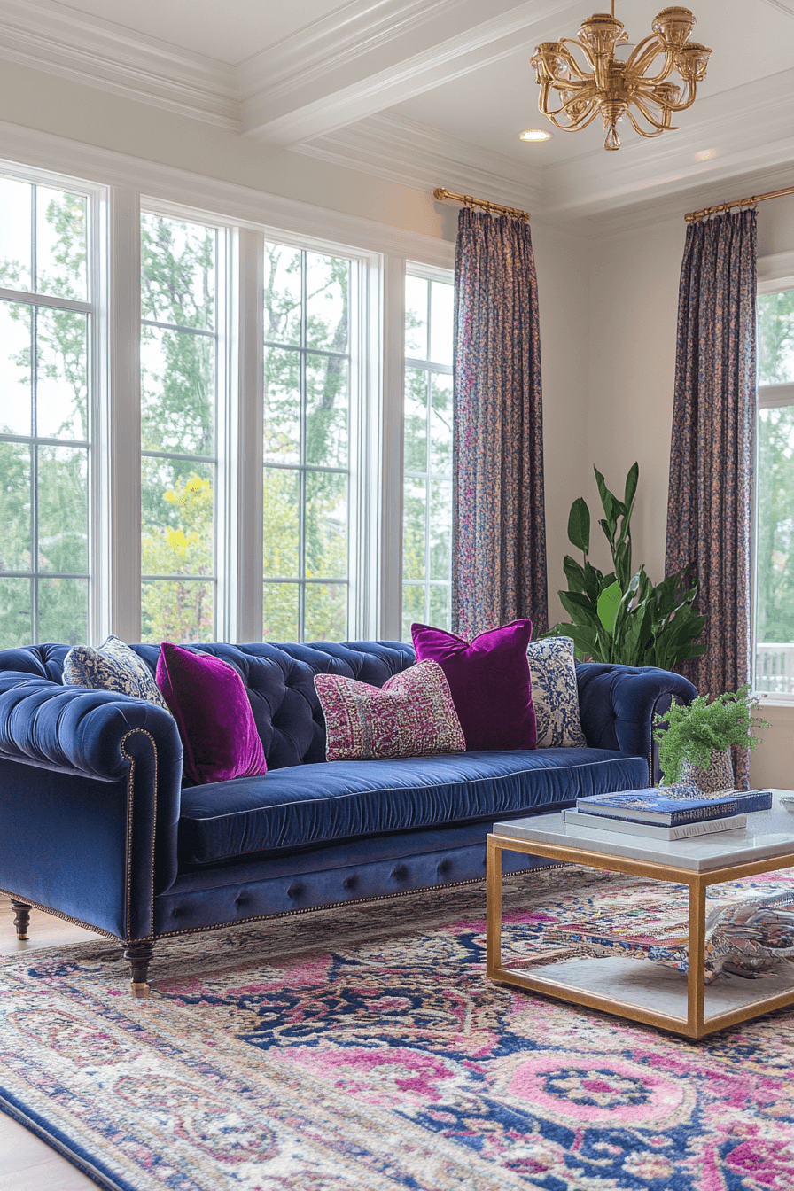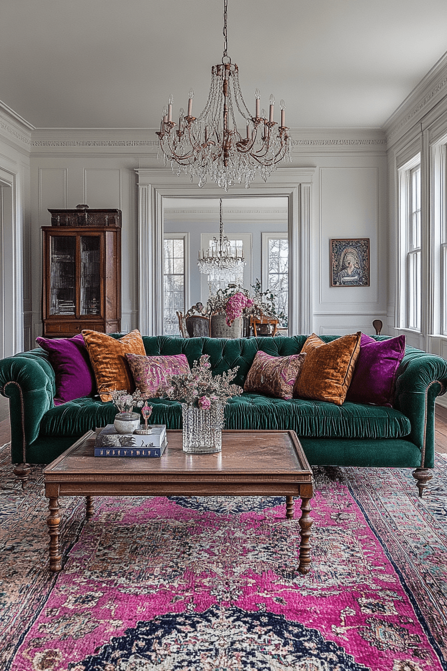 Using multiple jewel shades creates a rich spectrum within a stylish jewel tone living room. Sapphire, emerald, ruby, and amethyst tones can coexist beautifully when balanced with neutral surroundings. Plush materials such as velvet and silk intensify the vibrancy of the colors. Warm metallic accents introduce harmony between cool hues. A patterned statement rug can tie the palette together effortlessly. Tap to discover more colorful jewel tone living room inspiration.