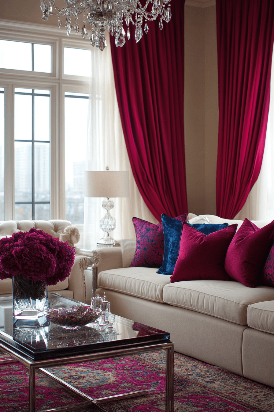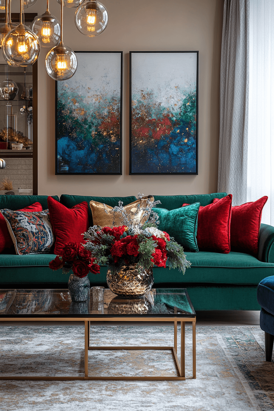 Glass and crystal details can make a jewel tone living room feel brighter and more glamorous. Sapphire pillows and ruby curtains gain extra sparkle when paired with crystal chandeliers or glass coffee tables. Reflective surfaces bounce light throughout the space, highlighting the depth of the jewel colors. Decorative crystal pieces add shimmer without overwhelming the design. Neutral walls help keep the room light and balanced. Click to see more crystal-inspired jewel tone living room designs.